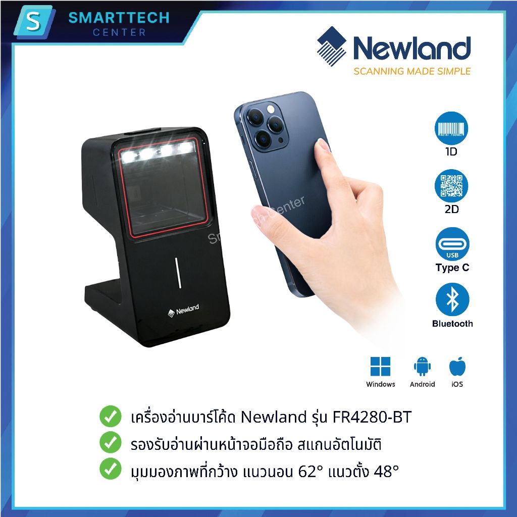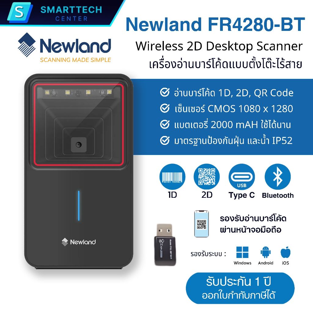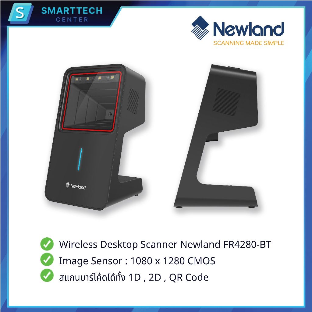 Newland รุ่น FR4280-BT เครื่องอ่านบาร์โค้ดตั้งโต๊ะไร้สาย Wireless 2D Desktop Scanner แสกนอัตโนมัติ อ่านผ่านหน้าจอมือถือ
