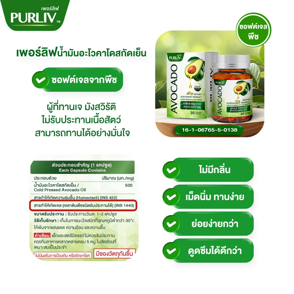 PURLIV AVOCADO เพอร์ลิฟ น้ำมันอะโวคาโดสกัดเย็น 3 กระปุก ลดความดัน บำรุงหัวใจ (กระปุกละ 30 แคปซูล)