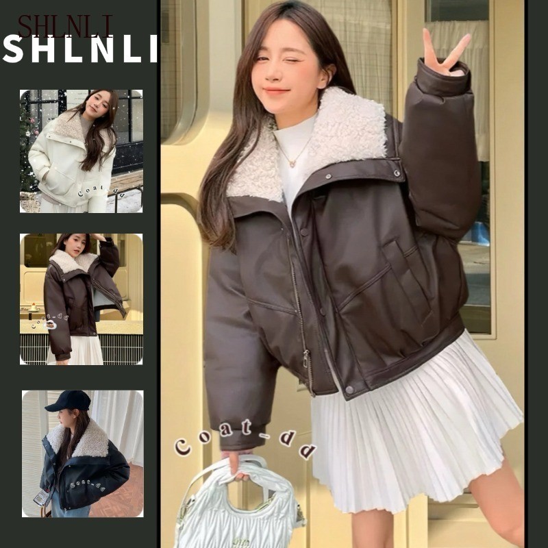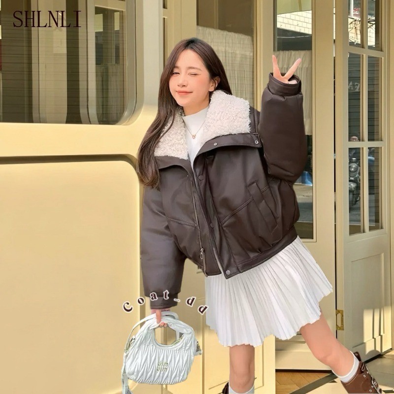 แจ็คเก็ตกันหนาวสไตล์วิทยาลัยสำหรับฤดูใบไม้ร่วงและฤดูหนาว แจ็คเก็ตสั้นทรงหลวมพร้อมซิปรูดและกระโปรงขนให้อบอุ่น