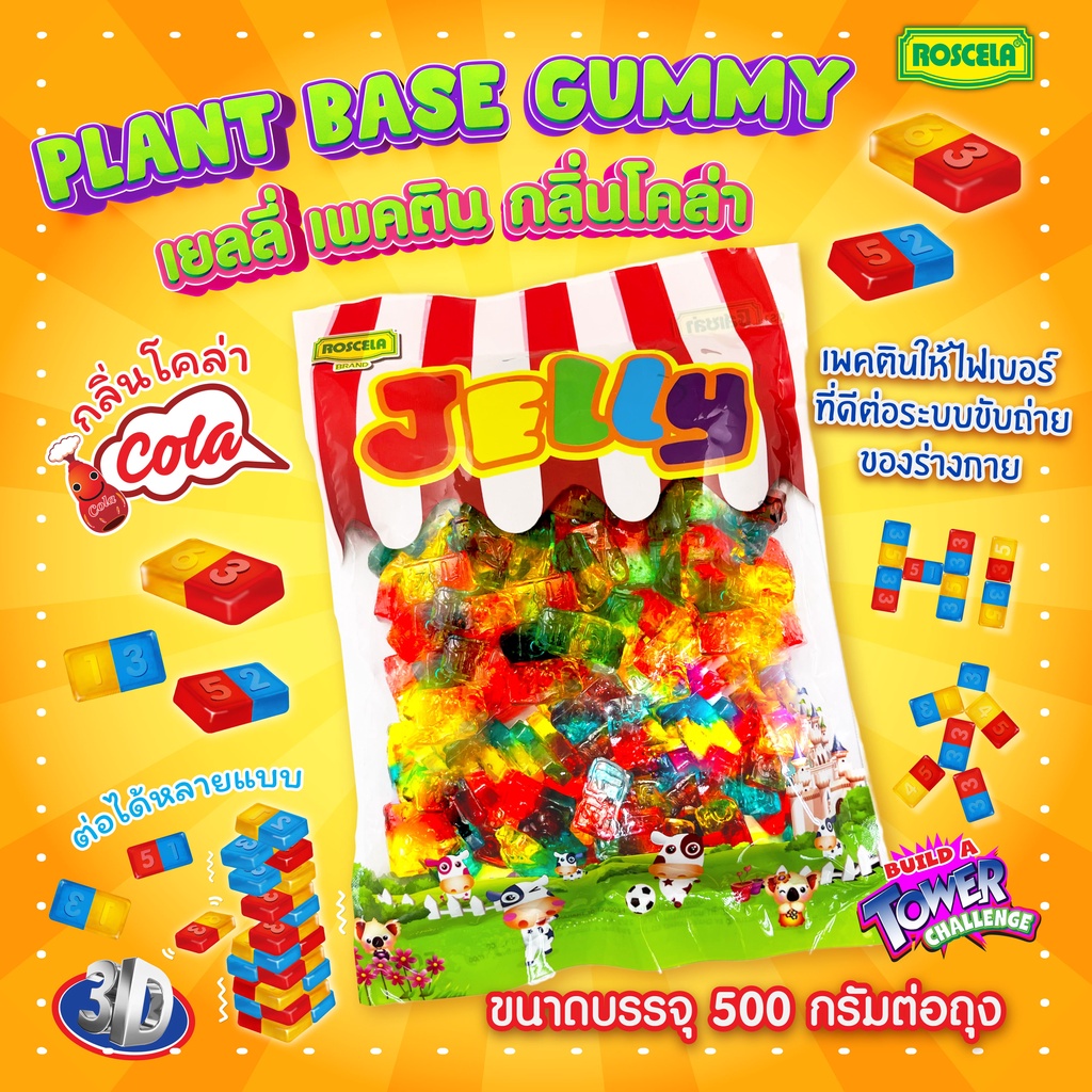 เยลลี่เพคติน รูปโดมิโน่ กลิ่นโคล่าและกลิ่นน้ำเขียว หลากสี (บรรจุถุงละ 500 กรัม 1 ถุง)