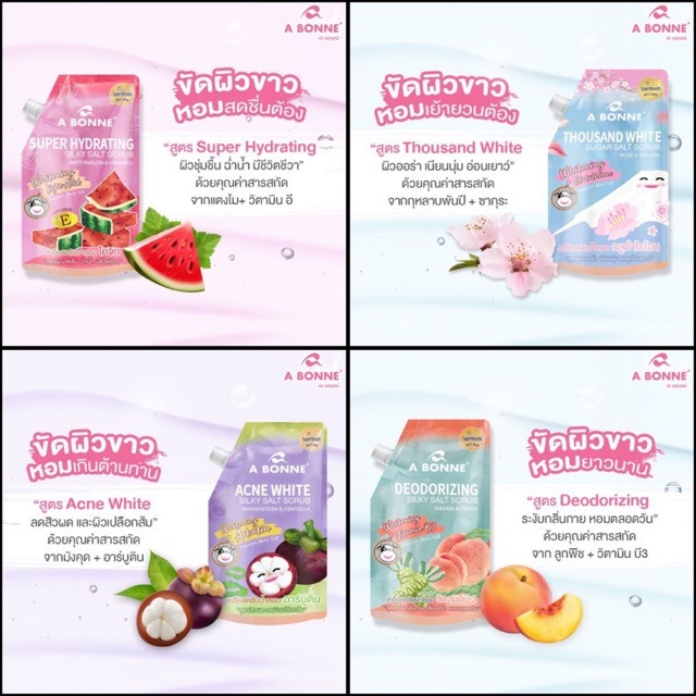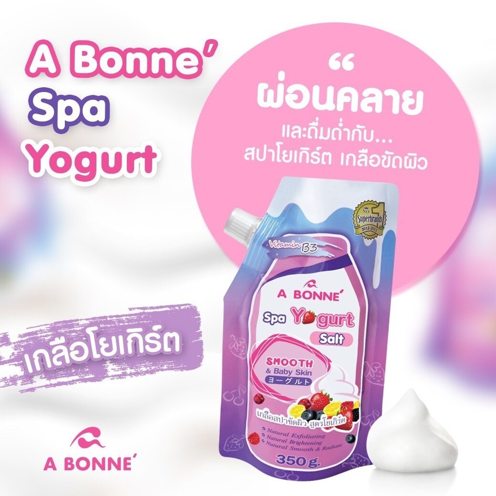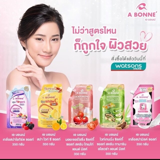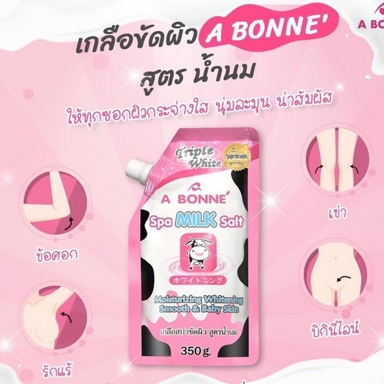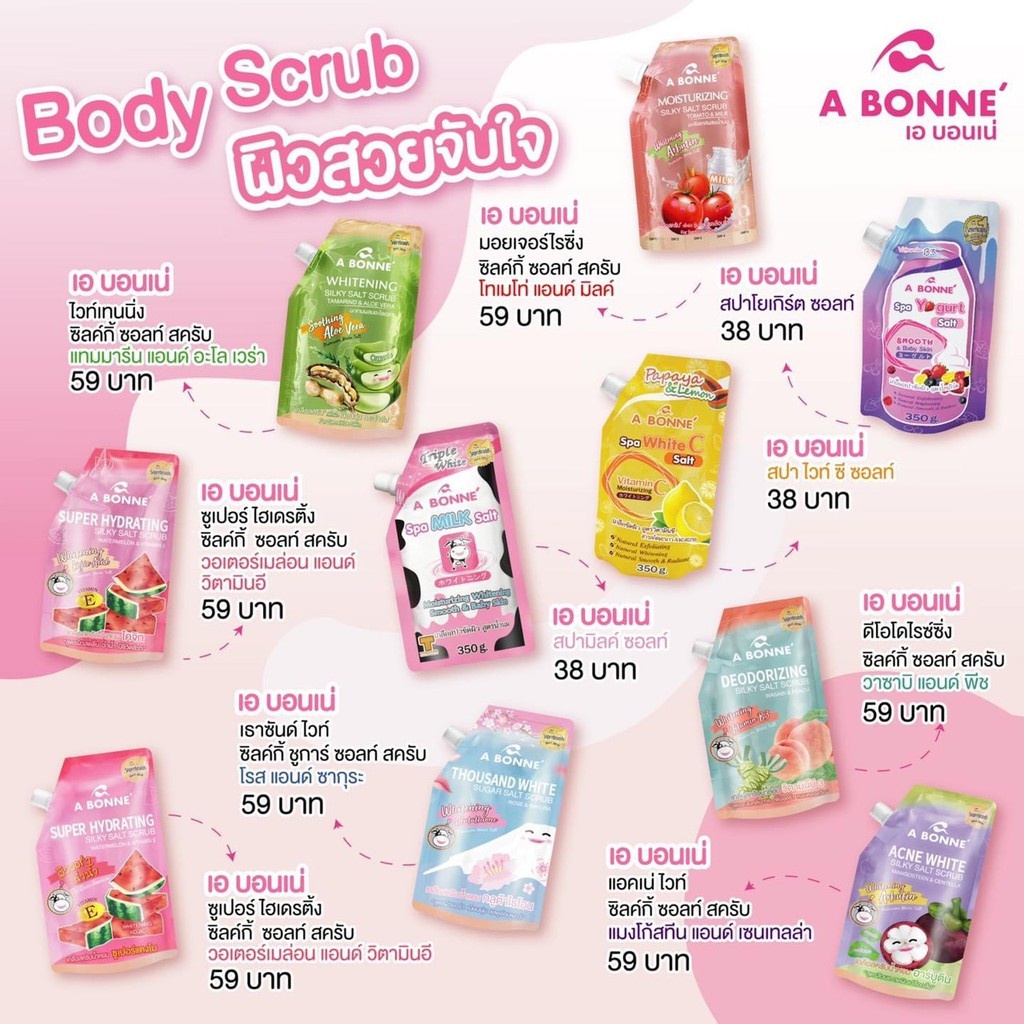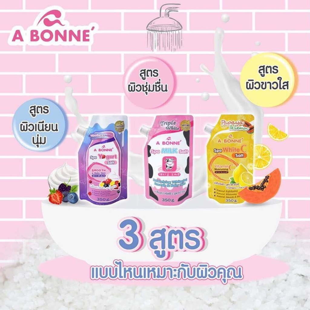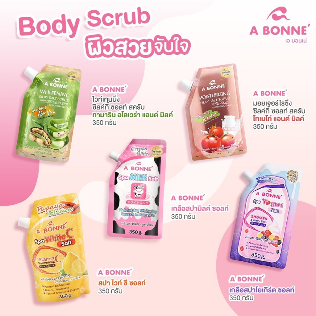 A Bonne เอ บอนเน่ เกลือสปาขัดผิว สูตรน้ำนม สครับผิวกาย ขัดผิว ผิวออร่า เกลือนมผสม Vitamin C Yoghurt 9สูตร 350กรัม