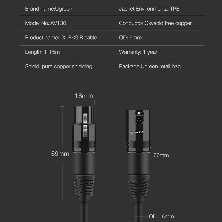 Ugreen XLR สายเคเบิลคาราโอเกะ ไมโครโฟน XLR ขยายสาย Mikrofon สําหรับเครื่องขยายเสียงผสม XLR
