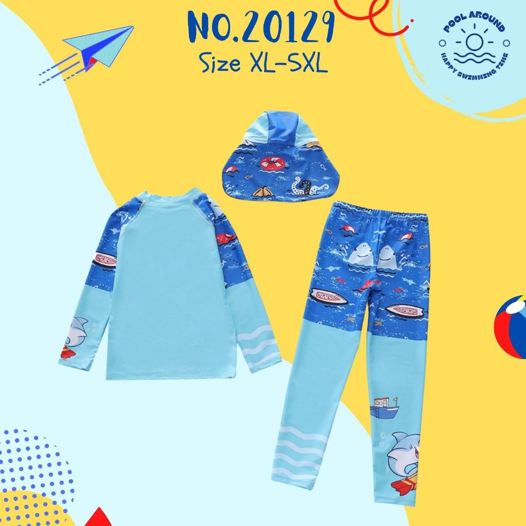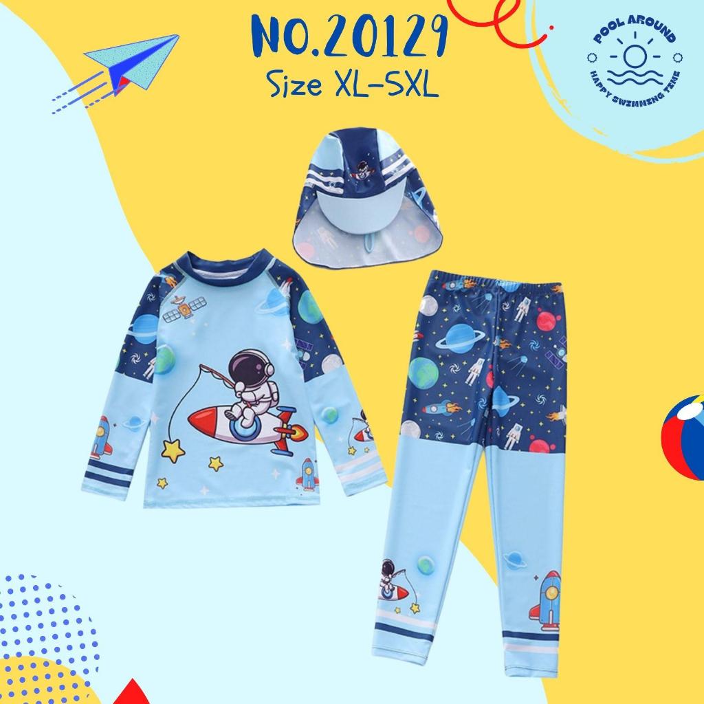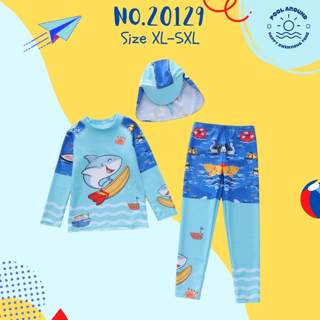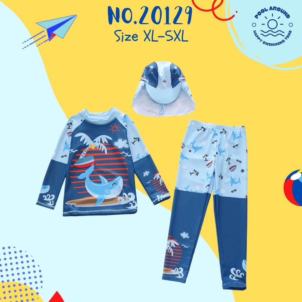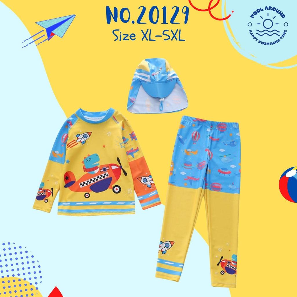 Poolaroundชุดว่ายน้ำเด็กผู้ชายแขนยาว ขายาว พร้อมหมวกกันแดด NO.20129 ลายน่ารักมาก ผ้ากันแสงแดดUVใส่ง่าย มีเชือกผูก