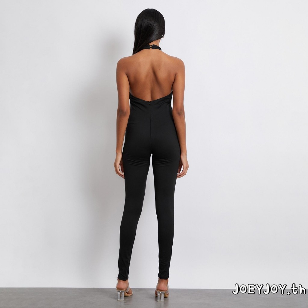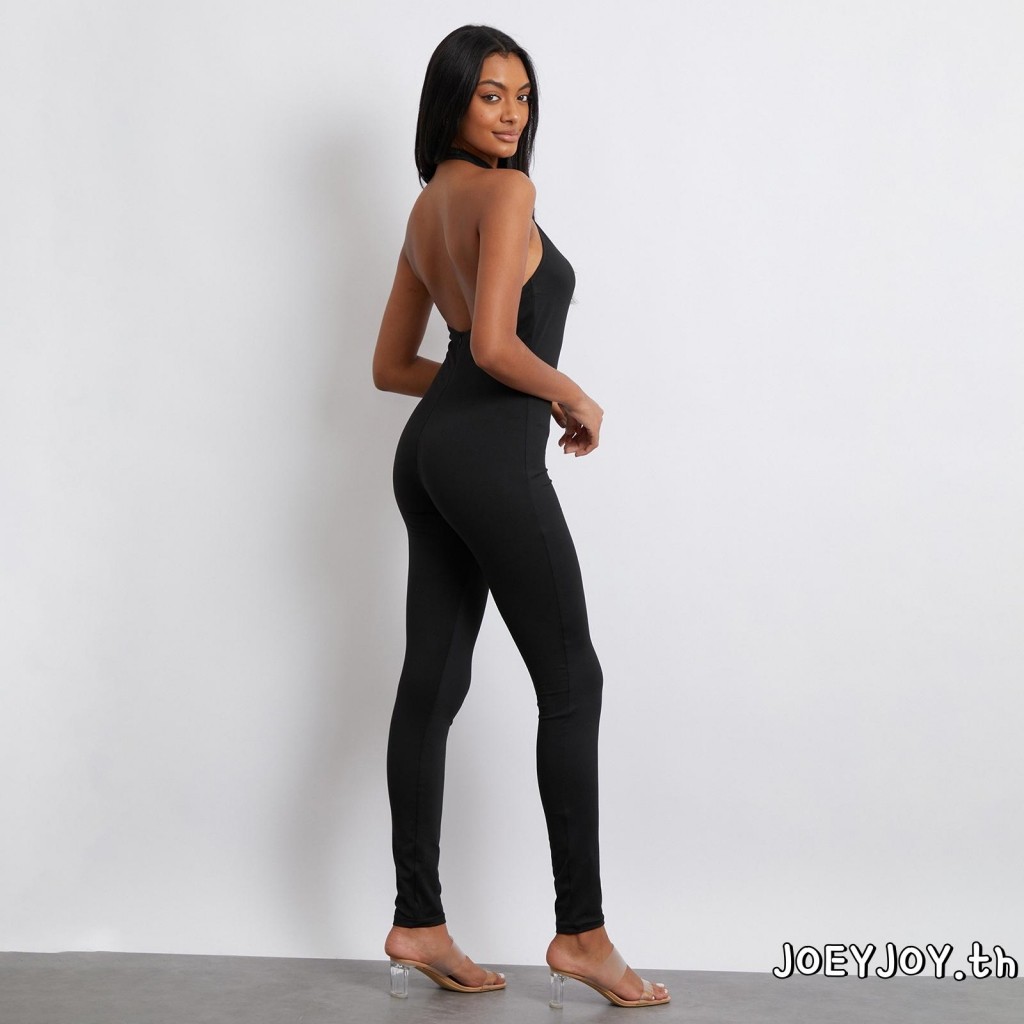 Joeyjoy-ชุดจั๊มสูทผู้หญิงแขนกุด Halterneck Backless Solid Slim Long Romper