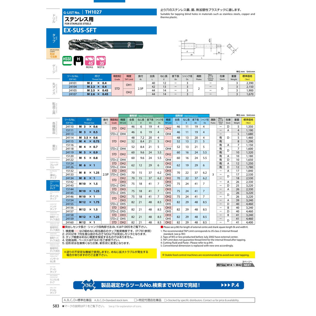 ดอกต๊าป ดอกต๊าปเครื่อง เกลียว เลื้อย OSG EX-SUS-SFT ขนาด M3 - M12 ดอกต๊าปแท้ ญี่ปุ่น