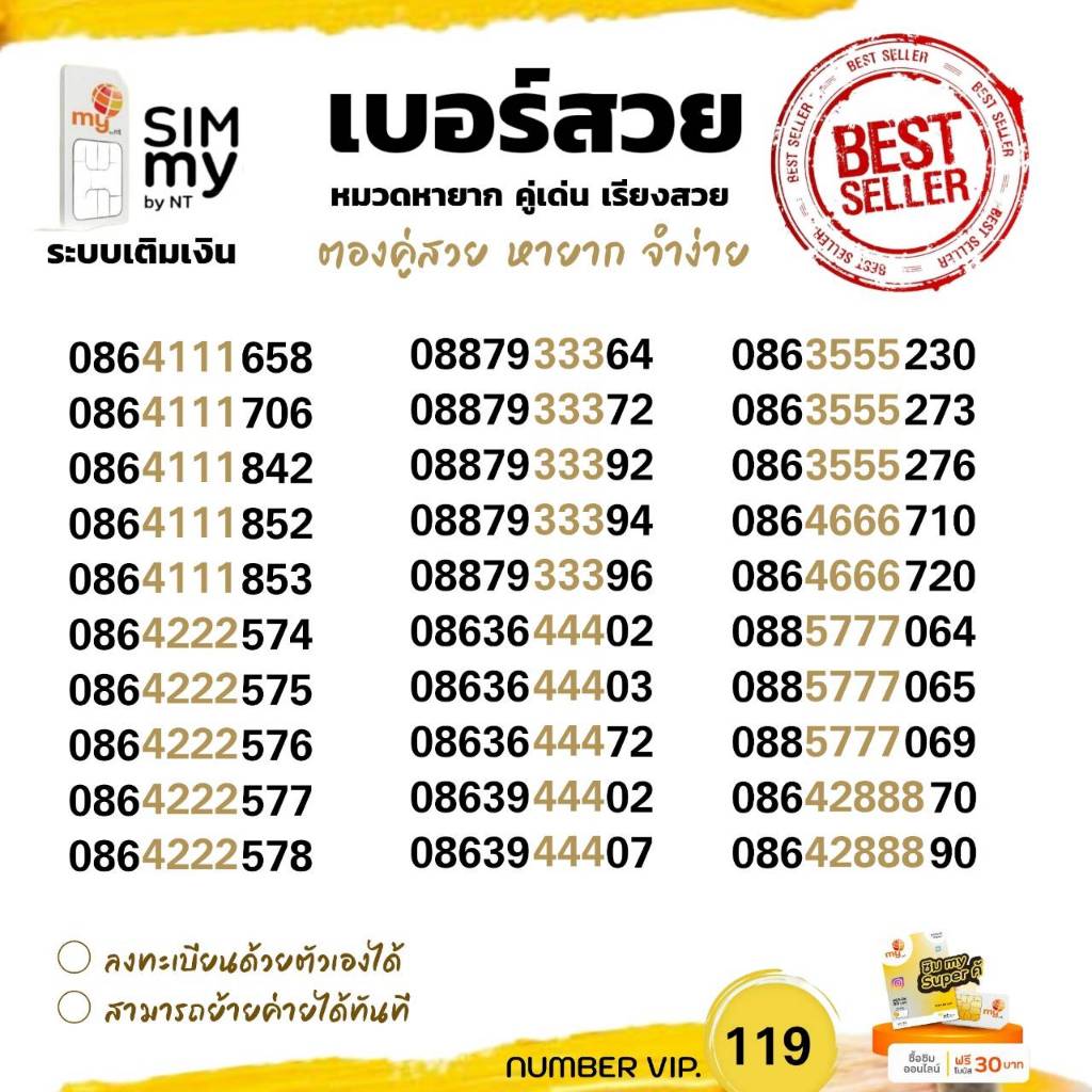 (vip.119)เบอร์สวยตองกลาง หมวดหายาก ราคาพิเศษ ระบบเติมเงิน สามารถย้ายค่ายได้ทันที