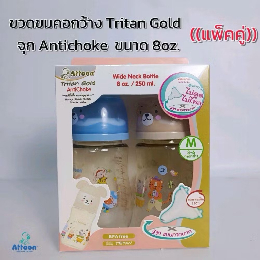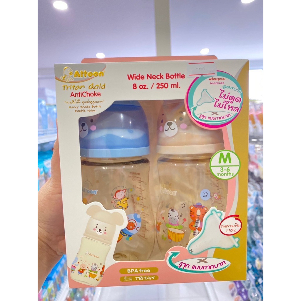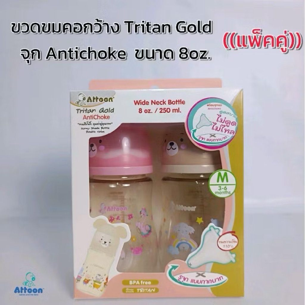 SET คู่ 2ขวด ขวดนมAttoon แอทตูน คอกว้าง สีชา จุกนมAntichoke ไม่ดูด ไม่ไหล 8oz.