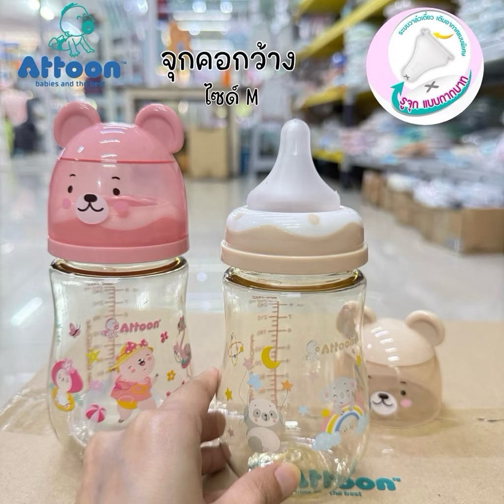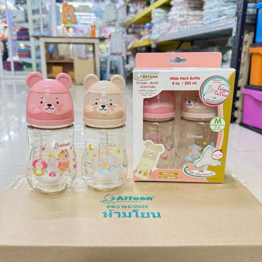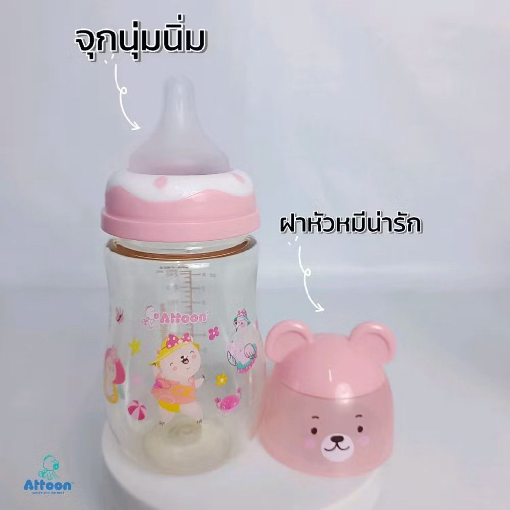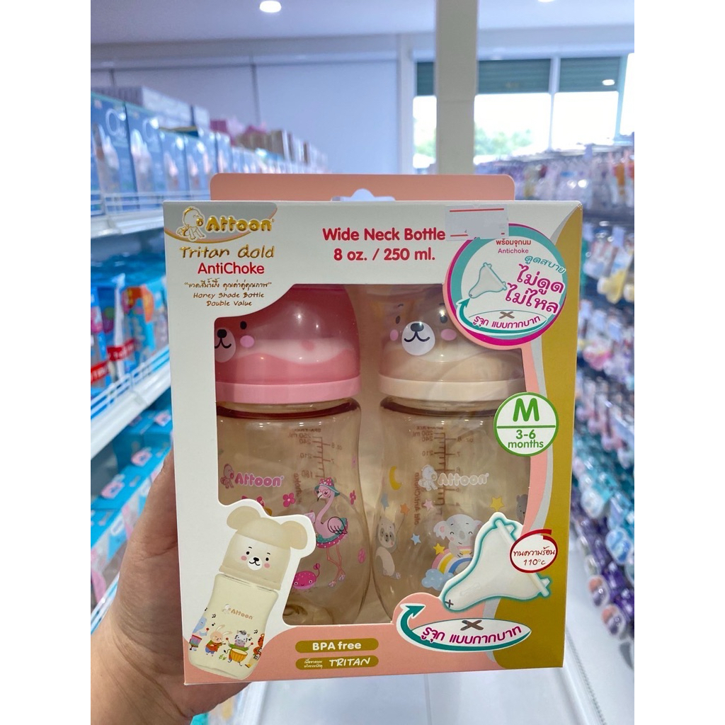 SET คู่ 2ขวด ขวดนมAttoon แอทตูน คอกว้าง สีชา จุกนมAntichoke ไม่ดูด ไม่ไหล 8oz.