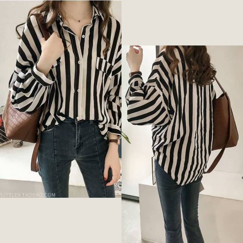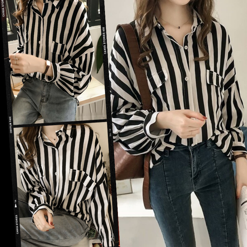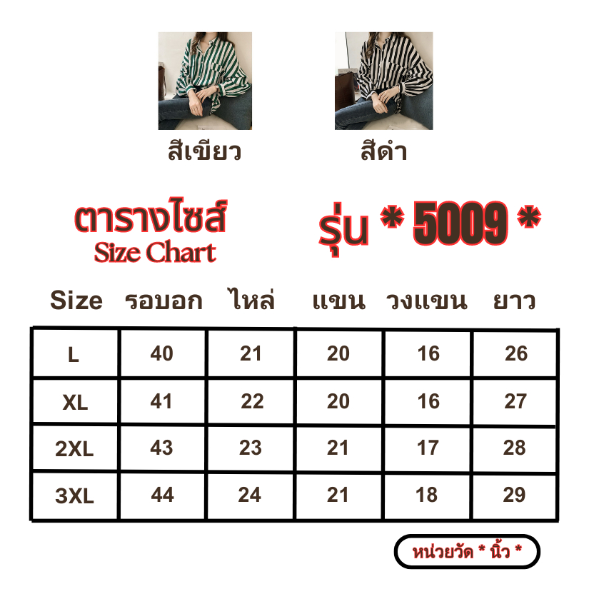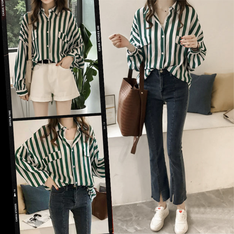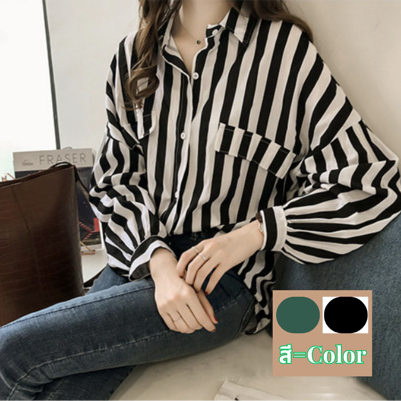 (5009) เสื้อเชิ้ต ผู้หญิง แขนยาว4ส่วน ลายทาง เสื้อคอปก กระดุมกลาง ดีเทลกระเป๋าหลอก