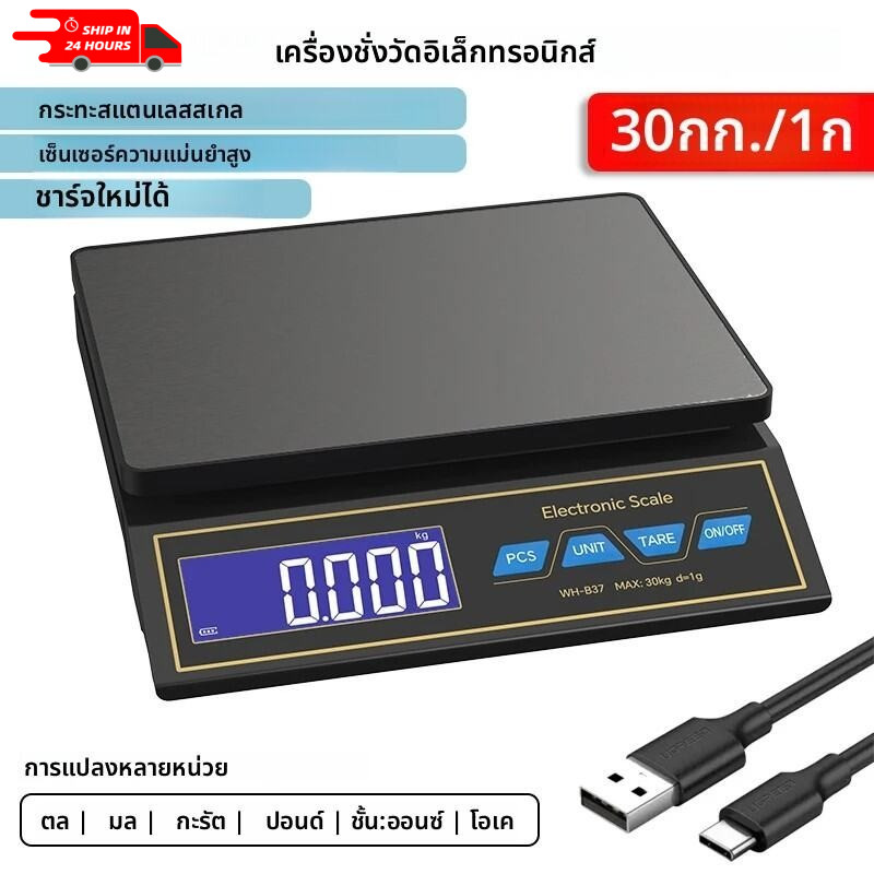 เครื่องชั่งดิจิตอลความแม่นยำสูง 30 กก./1 กรัม แผงสแตนเลส จอแสดงผลขนาดใหญ่ เครื่องชั่งอิเล็กทรอนิกส์แบบชาร์จไฟได้