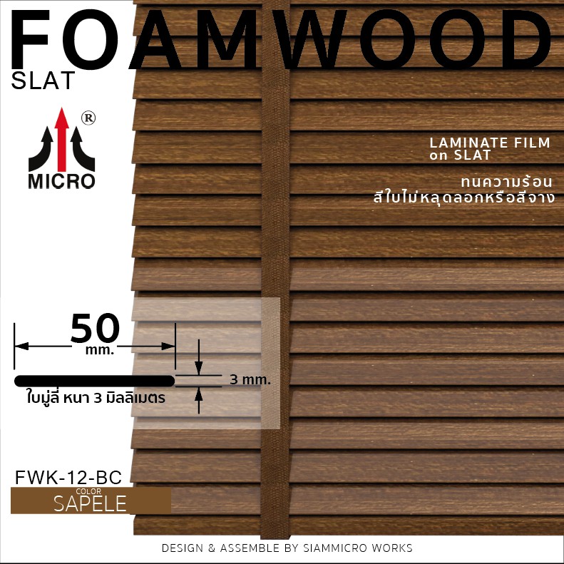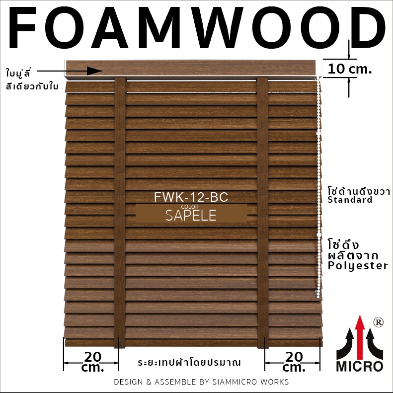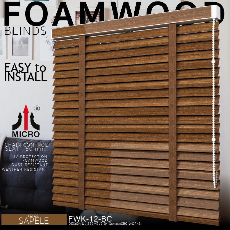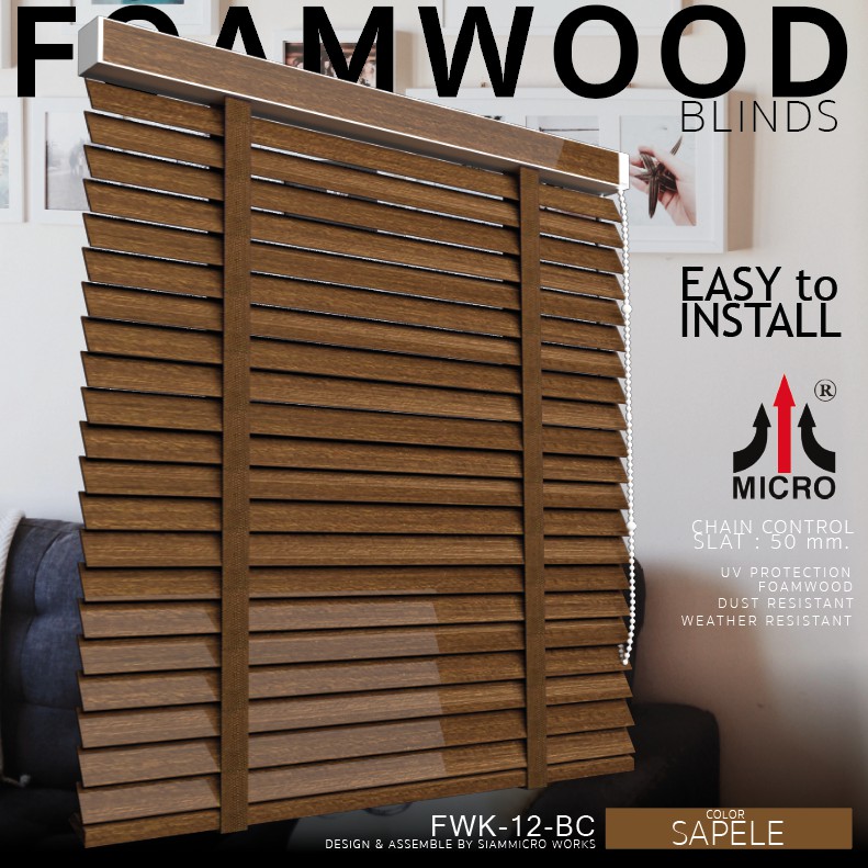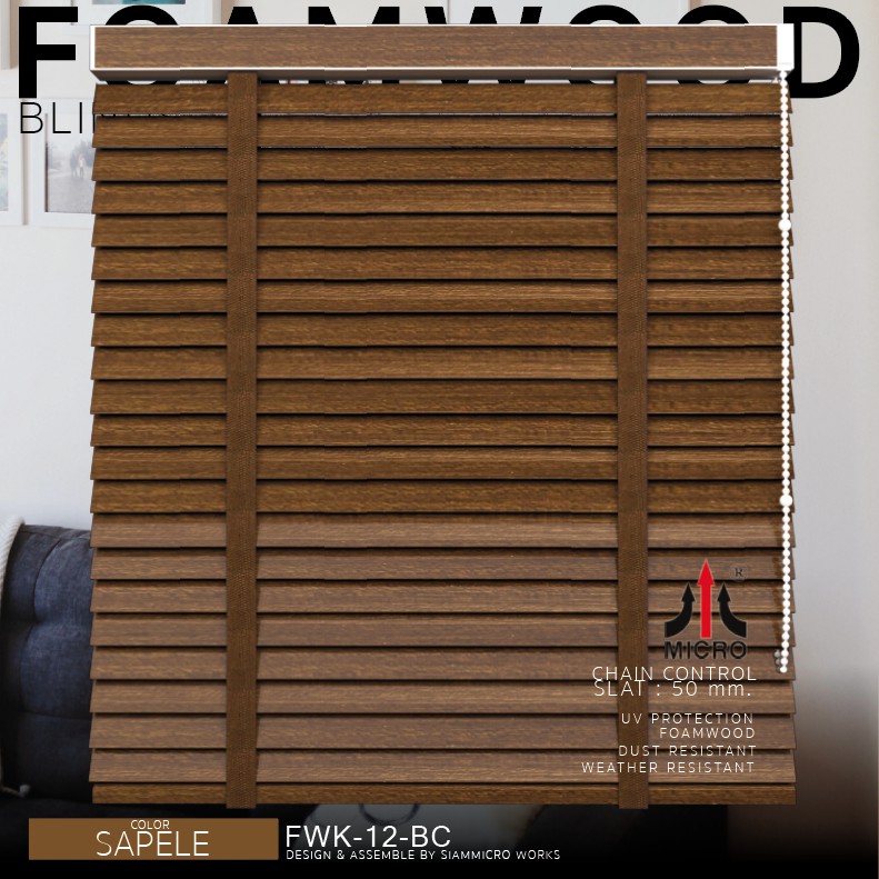 FWK12BC มู่ลี่ไม้โฟมวู๊ดแท้ รุ่นโซ่วน สี SAPELE ขนาดใบ 50 มิลลิเมตร กันแดดและความร้อน สามารถสั่งผลิตตามขนาดได้