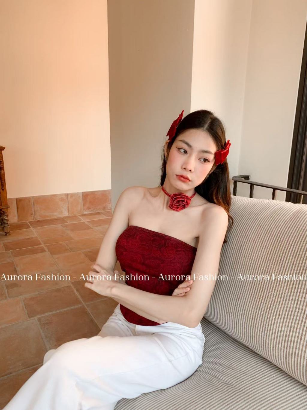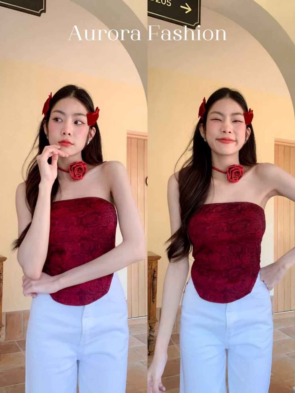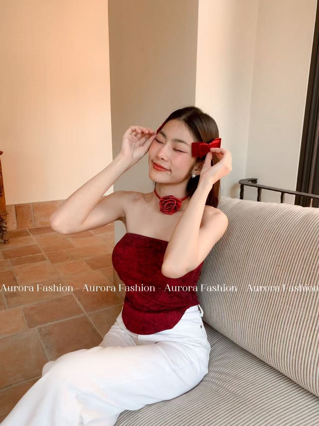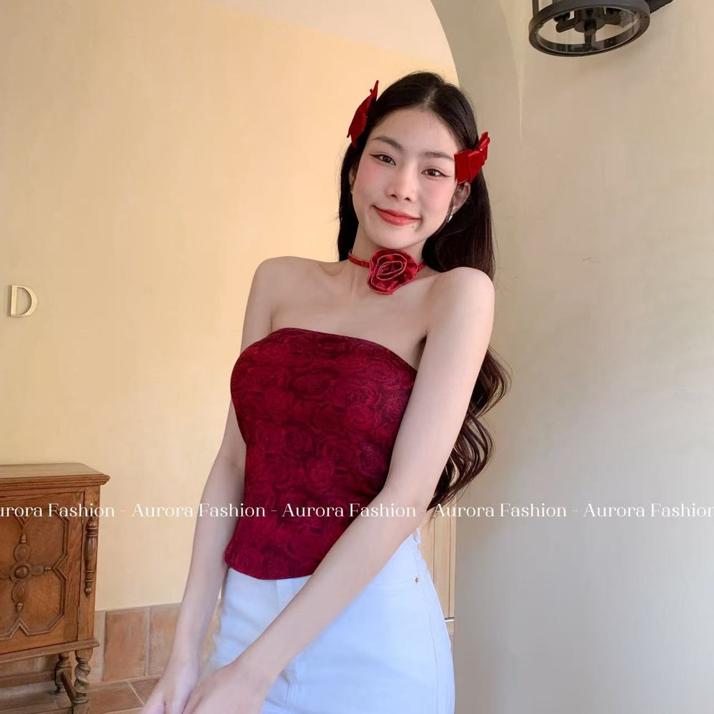 Aurora🛒พร้อมส่ง🚚(รูปถ่ายจากงานจริง) เกาะอกลายมัดย้อมดำแดง ไม่มีฟองน้ำ ทรงรัดตัว