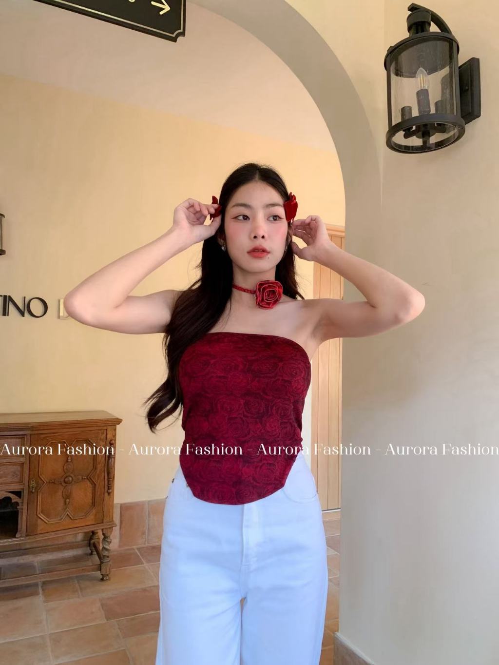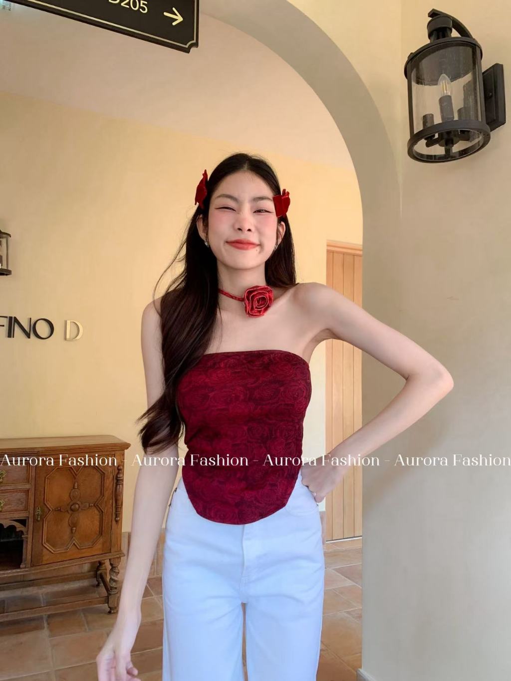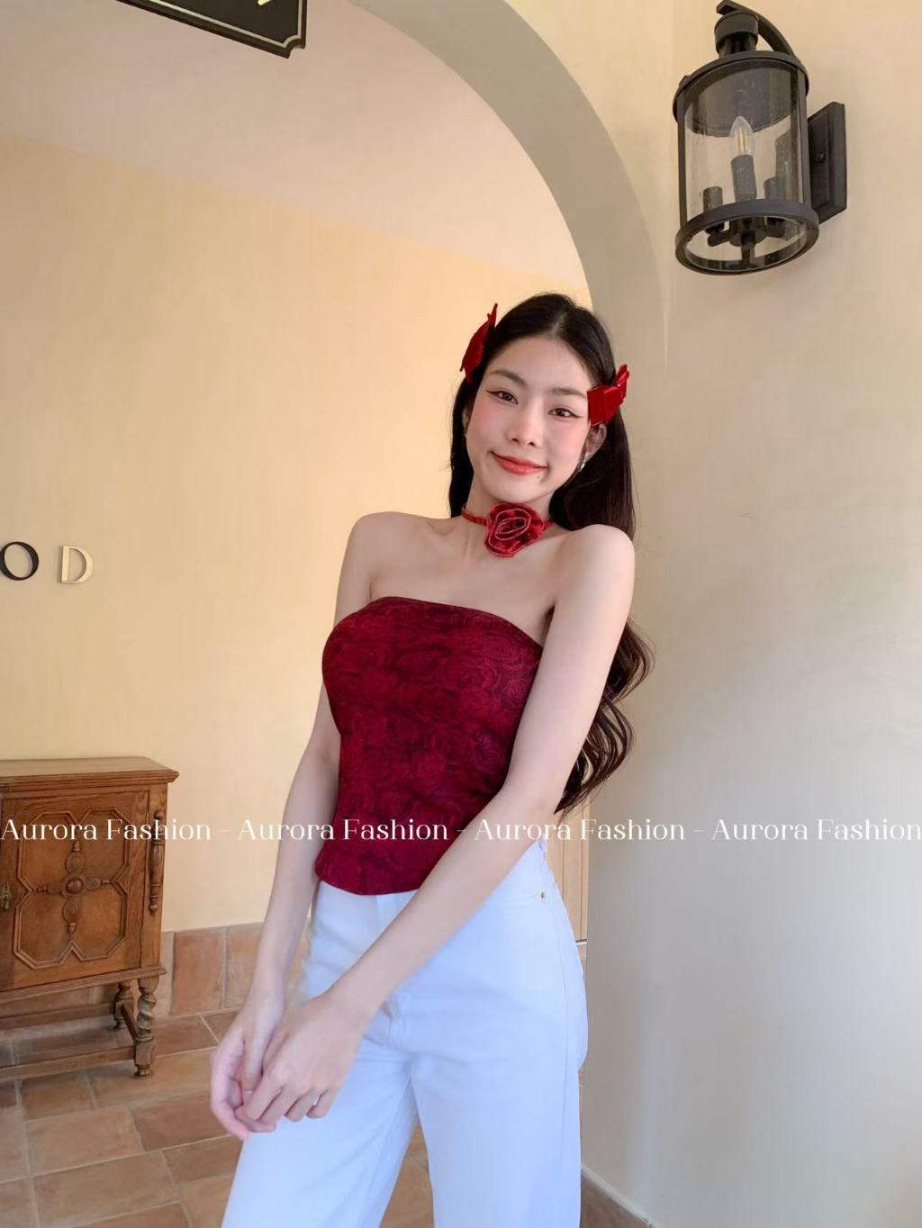 Aurora🛒พร้อมส่ง🚚(รูปถ่ายจากงานจริง) เกาะอกลายมัดย้อมดำแดง ไม่มีฟองน้ำ ทรงรัดตัว