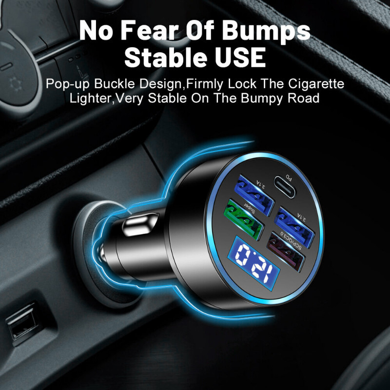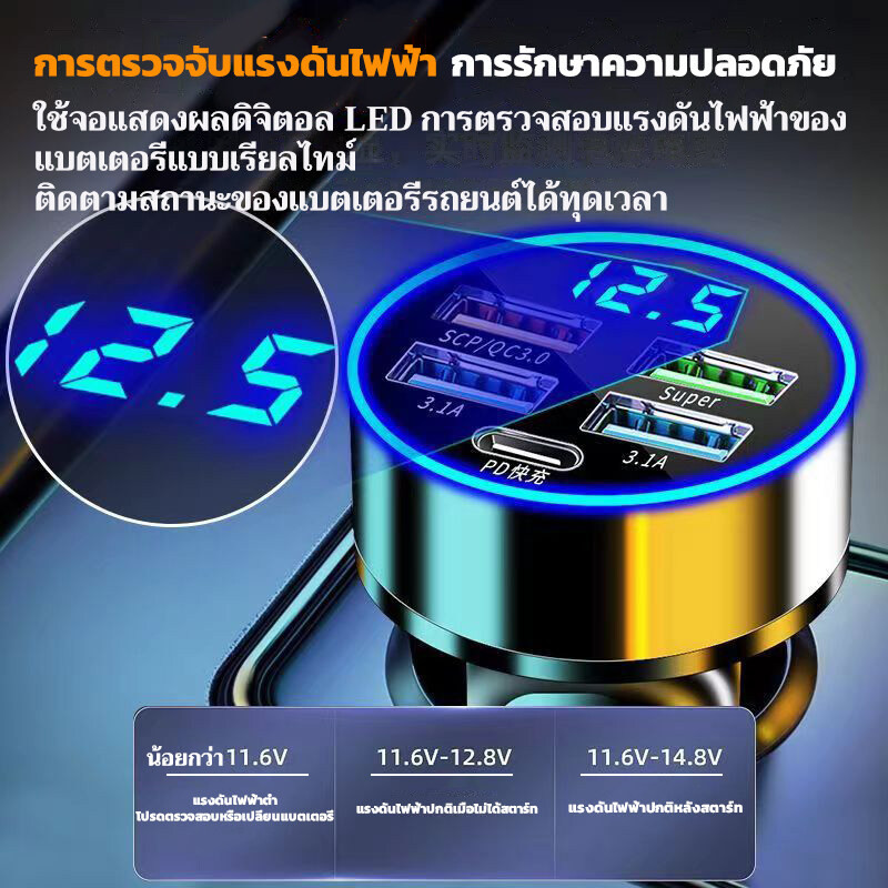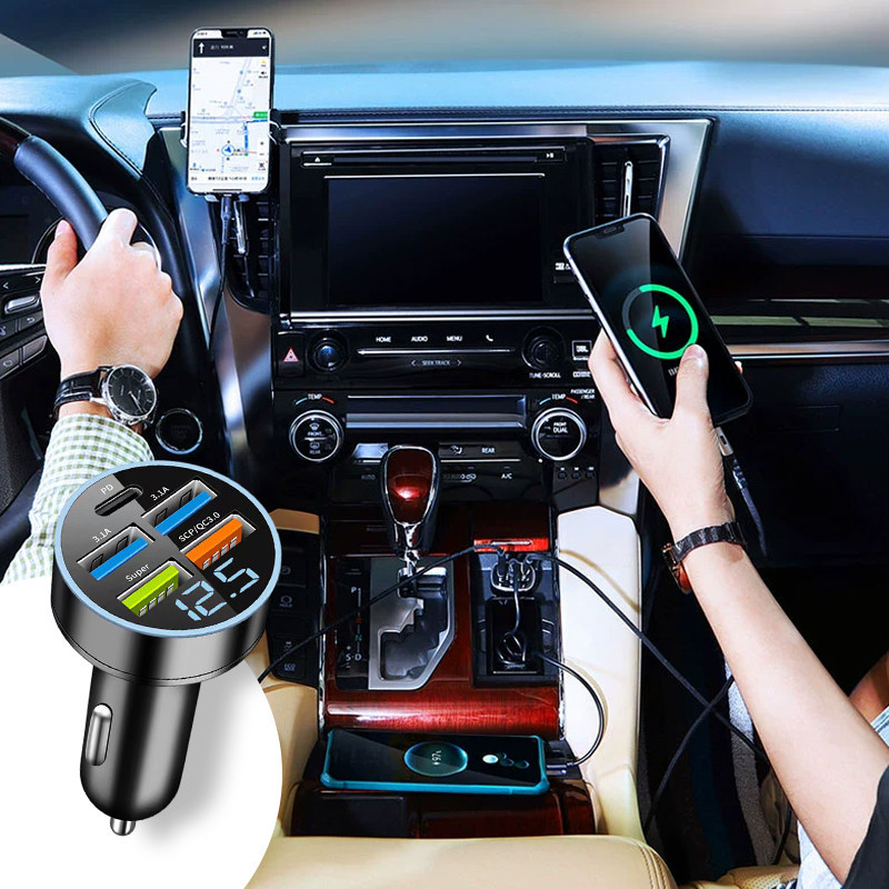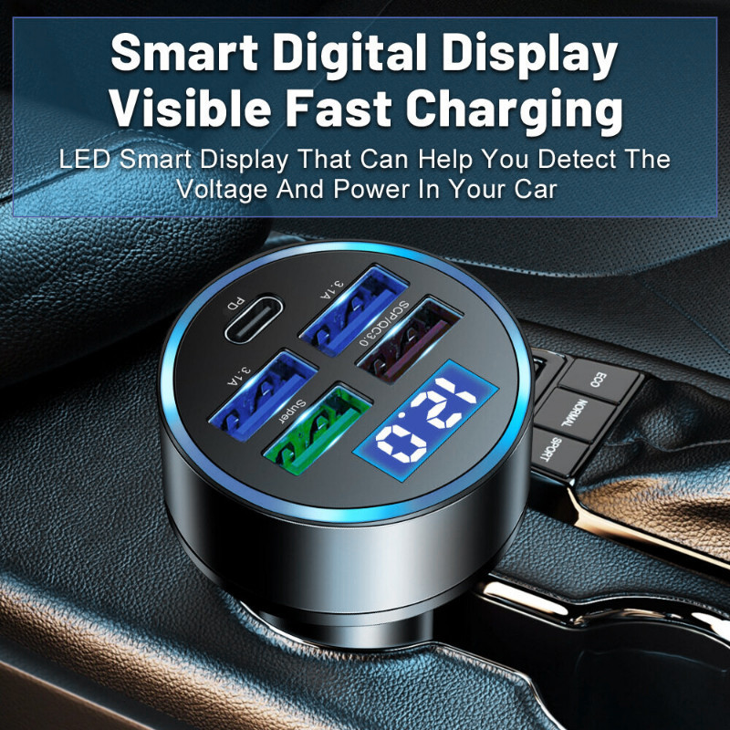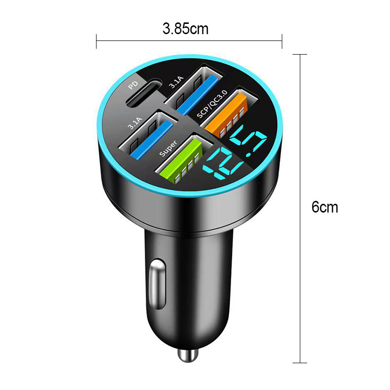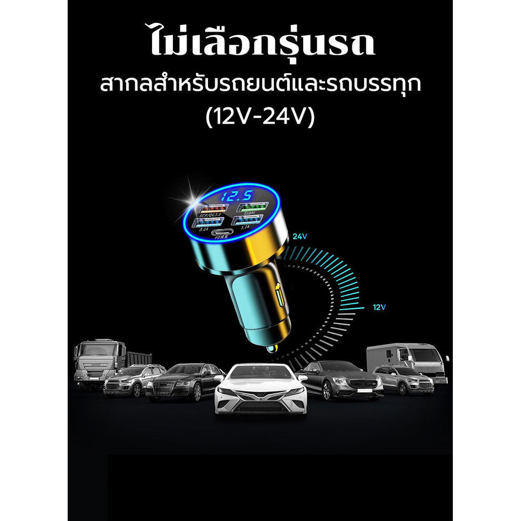 5 in 1 ที่ชาร์จในรถ 4USB+Type C เครื่องชาร์จไฟแบบเร็วขนาดเล็ก มี LED และจอแสดงผลแรงดันไฟฟ้า จ อะแดปเตอร์ ชาร์จในรถ
