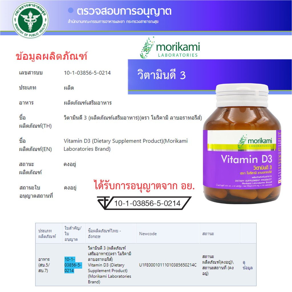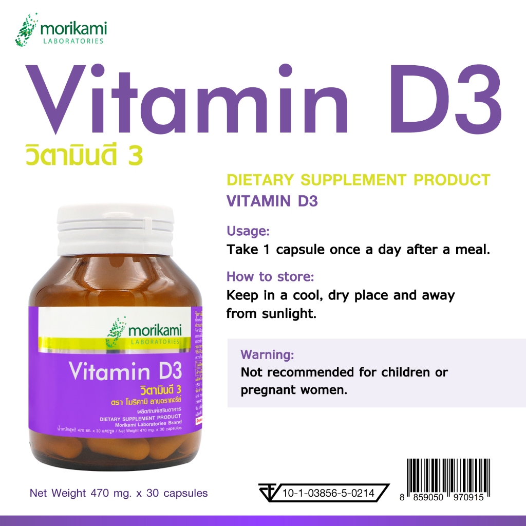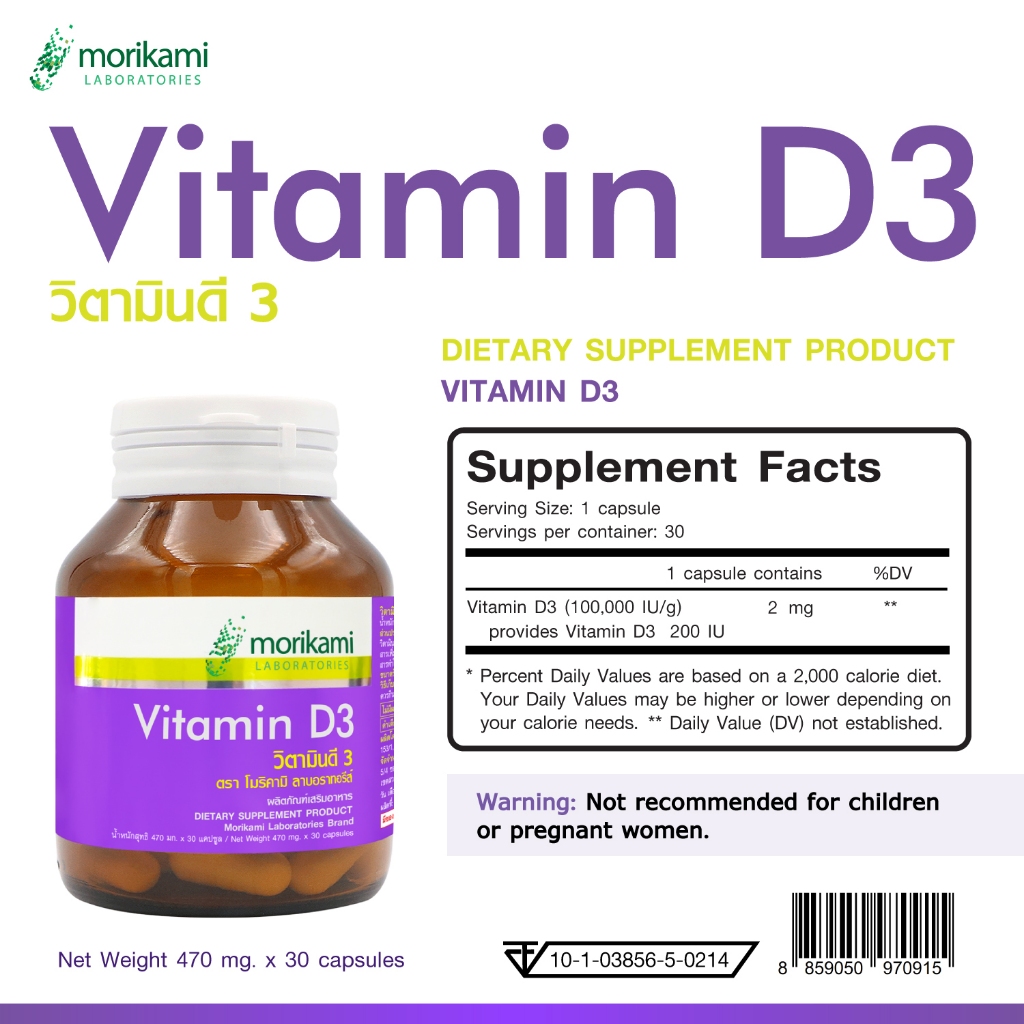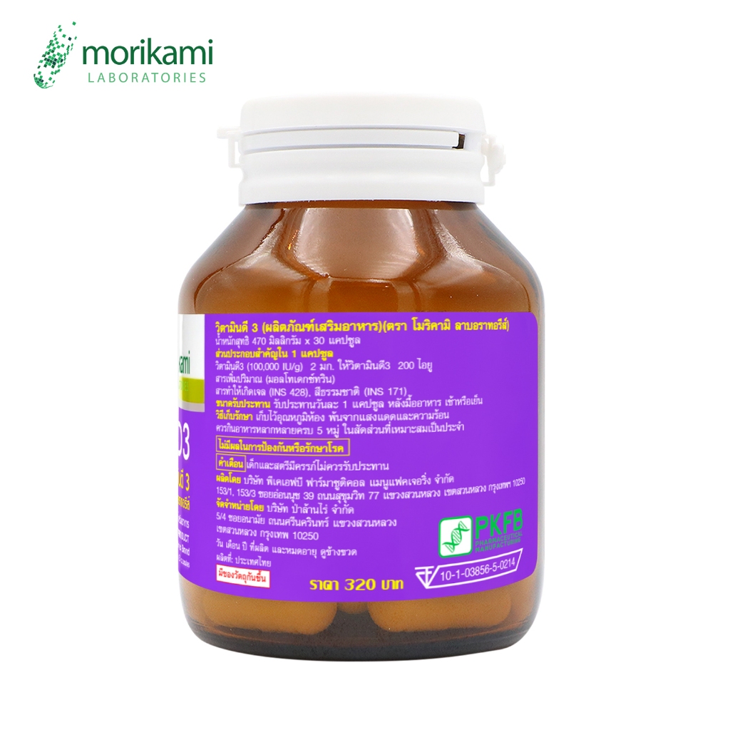 [แพ็ค 3 ขวด] วิตามินดี3 โมริคามิ Vitamin D3 Morikami ให้วิตามินดี3 200 ไอยู Vitamin D3 200 IU วิตามิน ดี3