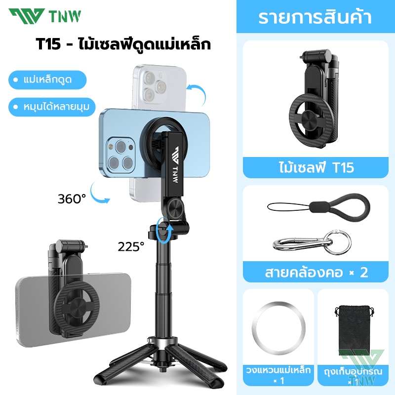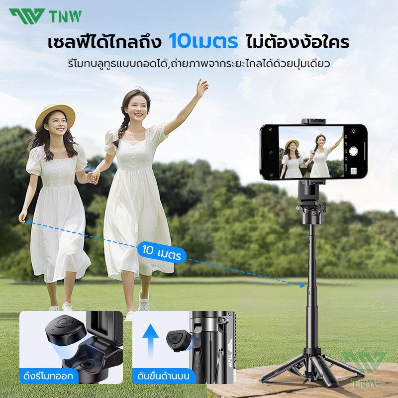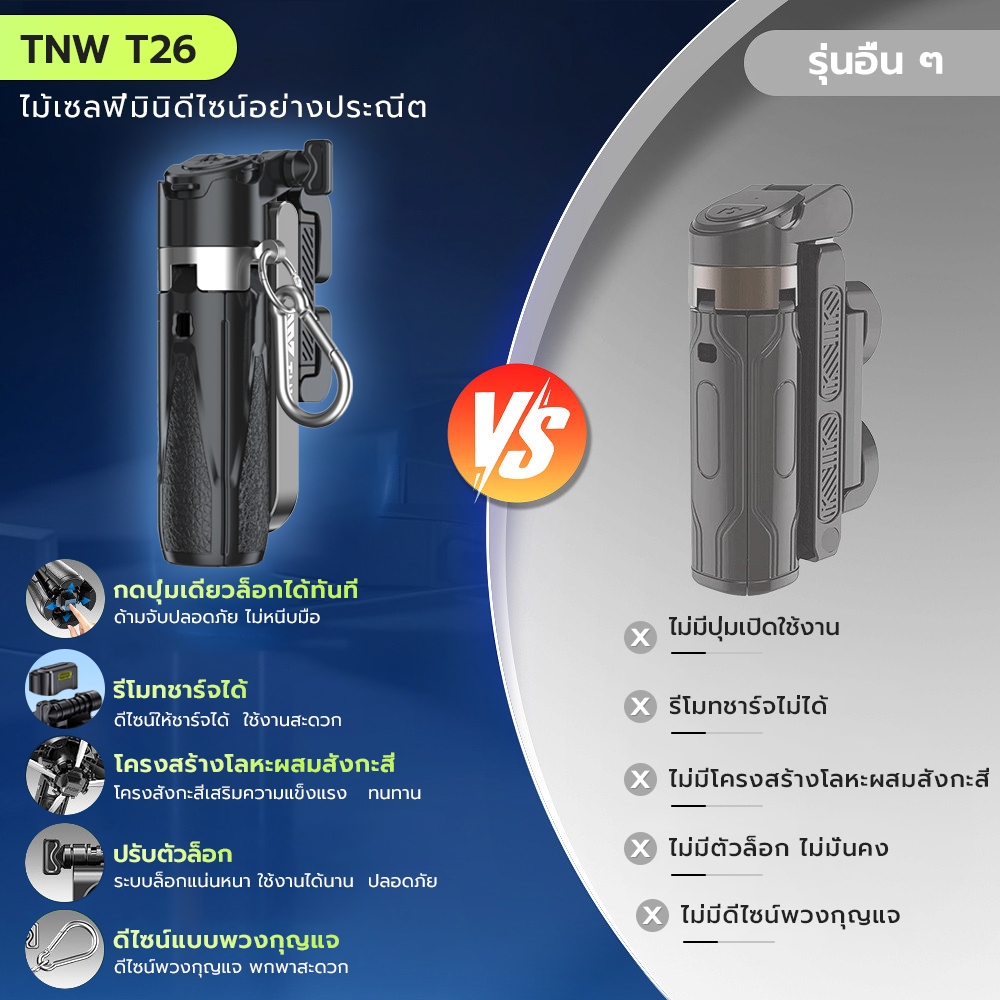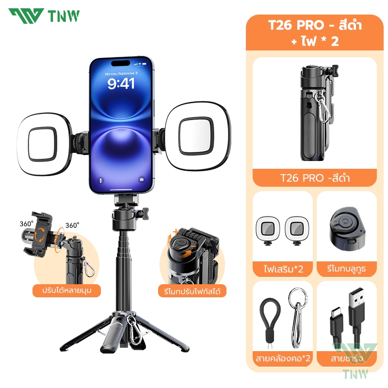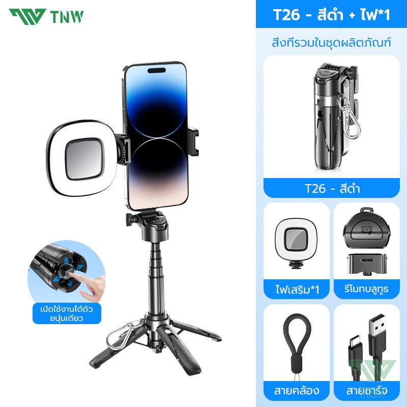 TNW T26 3in1 Mini ไม้เซลฟี่ ขยายได้ Grip Phone Tripod รีโมทบลูทูธในตัว Selfie Stick มีไฟLED สำหรับการถ่ายวิดีโอ Vlog