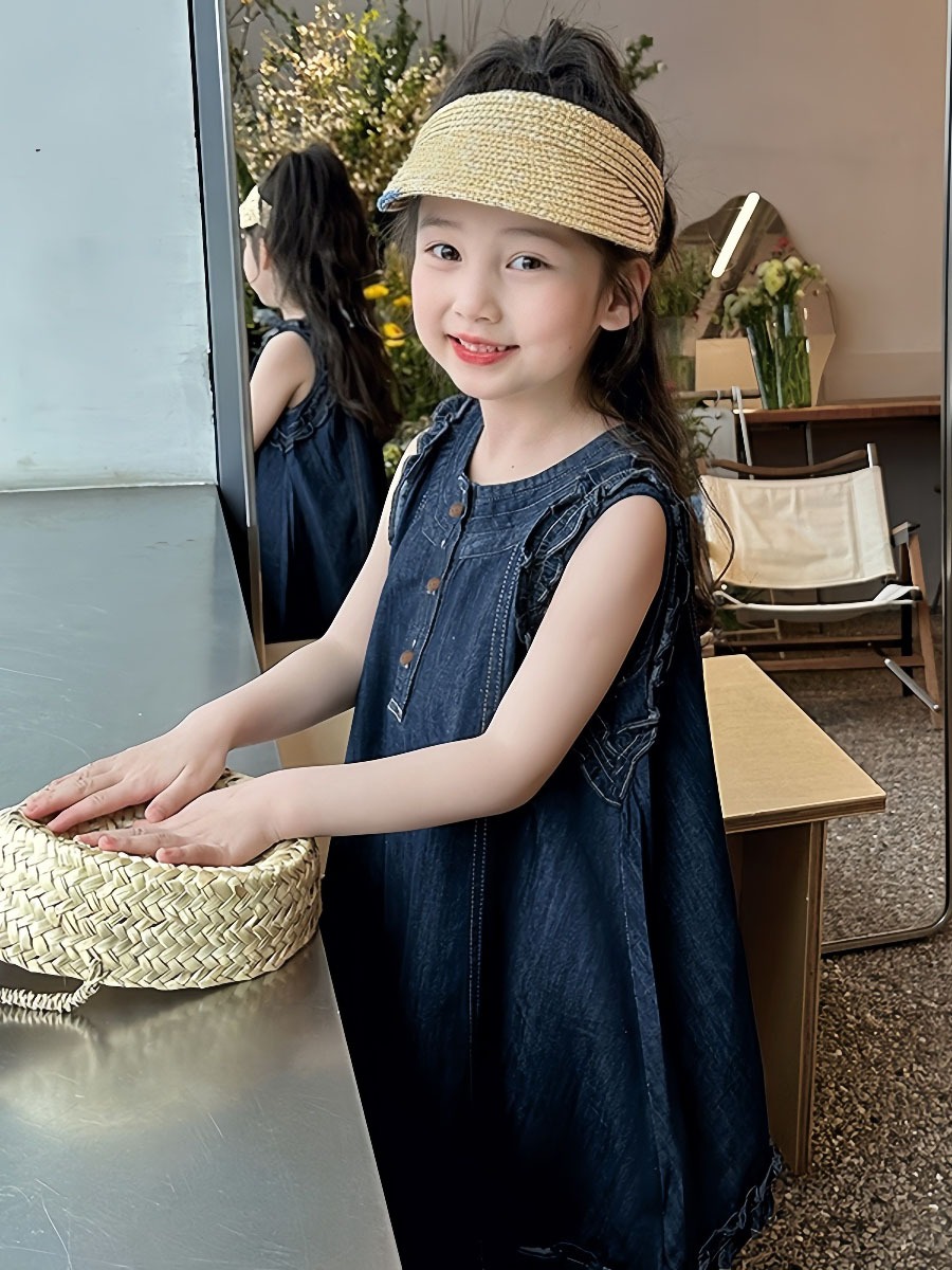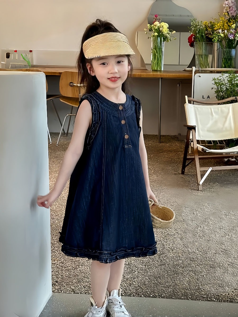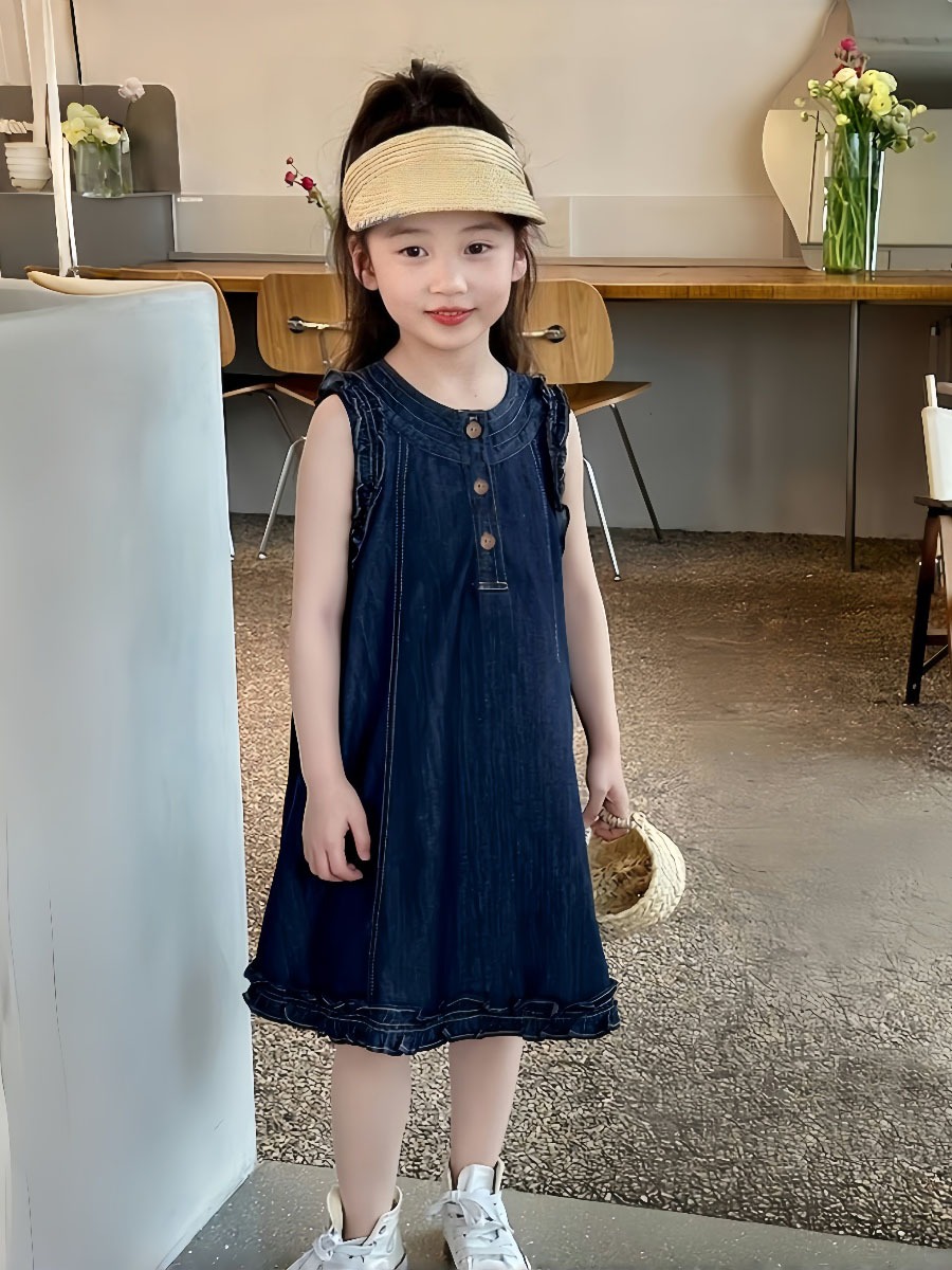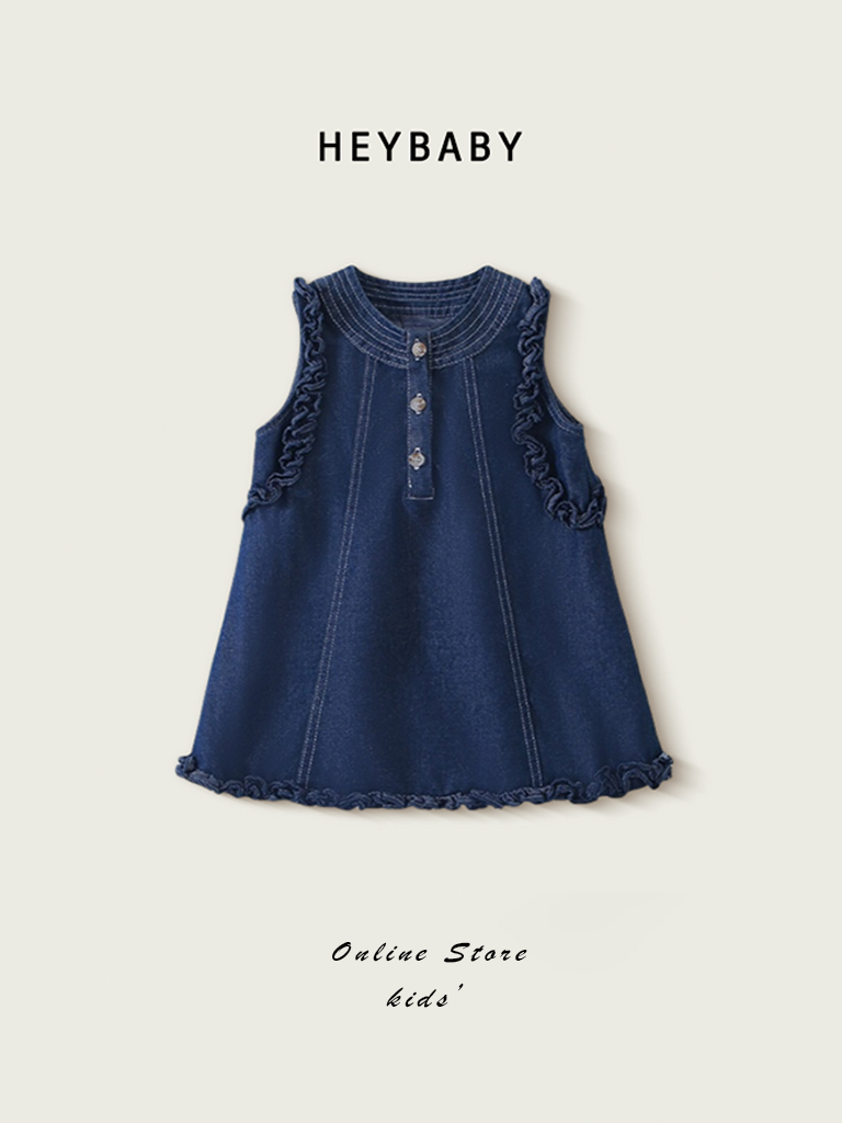 1-7 ปี ชุดเดรสเด็กผู้หญิงฤดูร้อนปี ชุดเดรสยีนส์เด็กผู้หญิง เดรสเด็กแขนกุด สไตล์เกาหลี ผ้านุ่ม