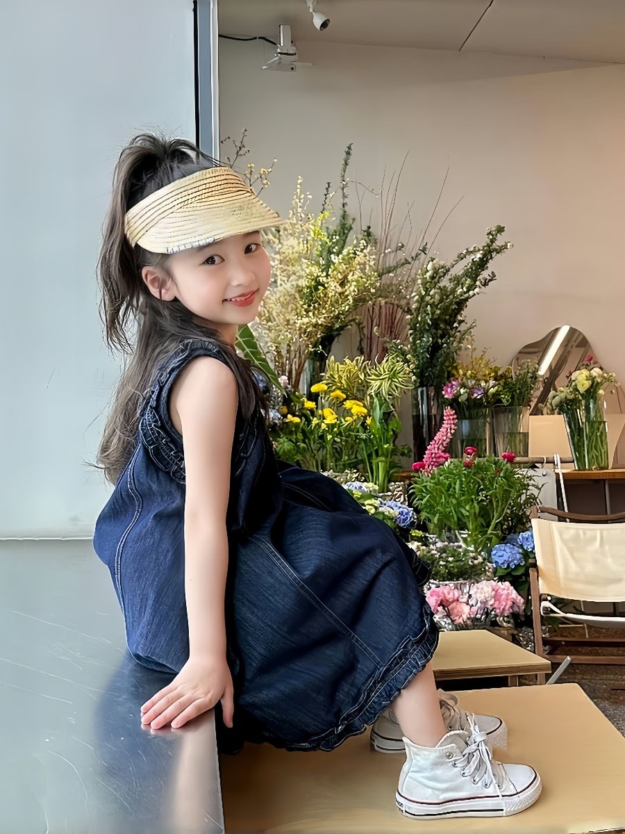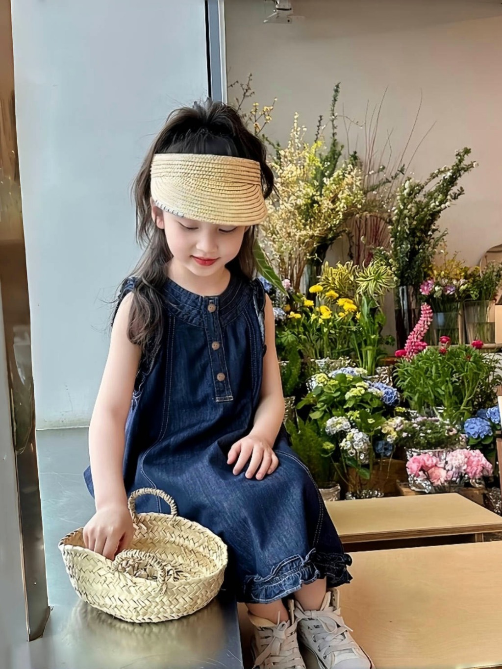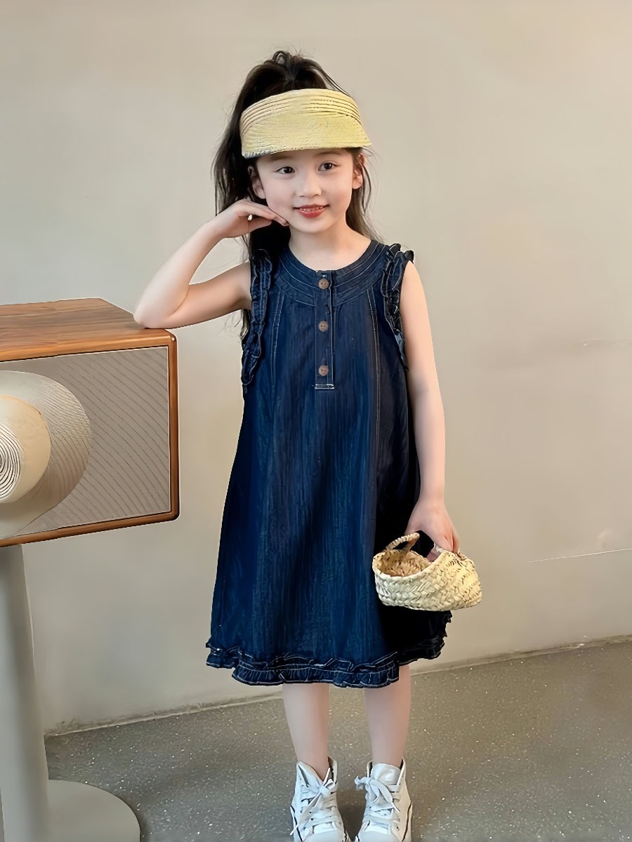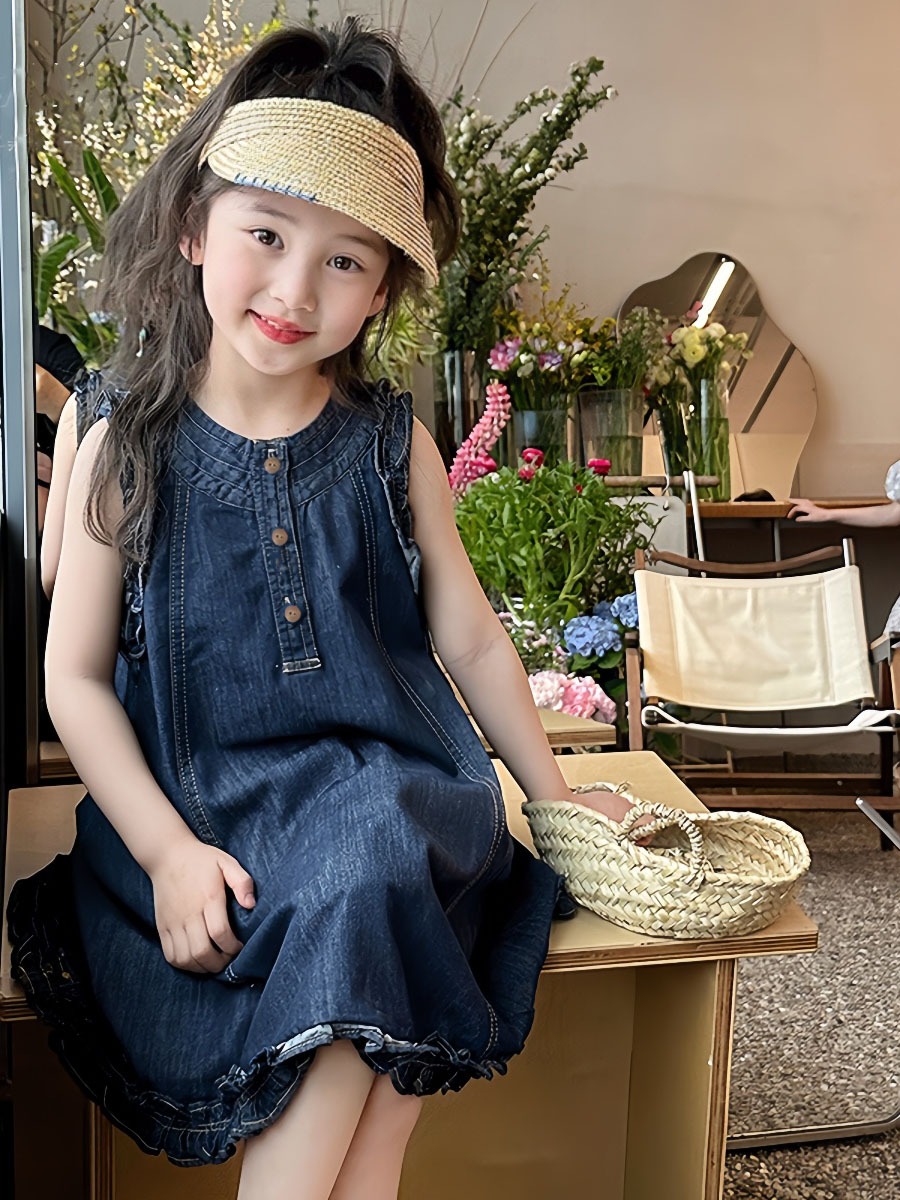 1-7 ปี ชุดเดรสเด็กผู้หญิงฤดูร้อนปี ชุดเดรสยีนส์เด็กผู้หญิง เดรสเด็กแขนกุด สไตล์เกาหลี ผ้านุ่ม