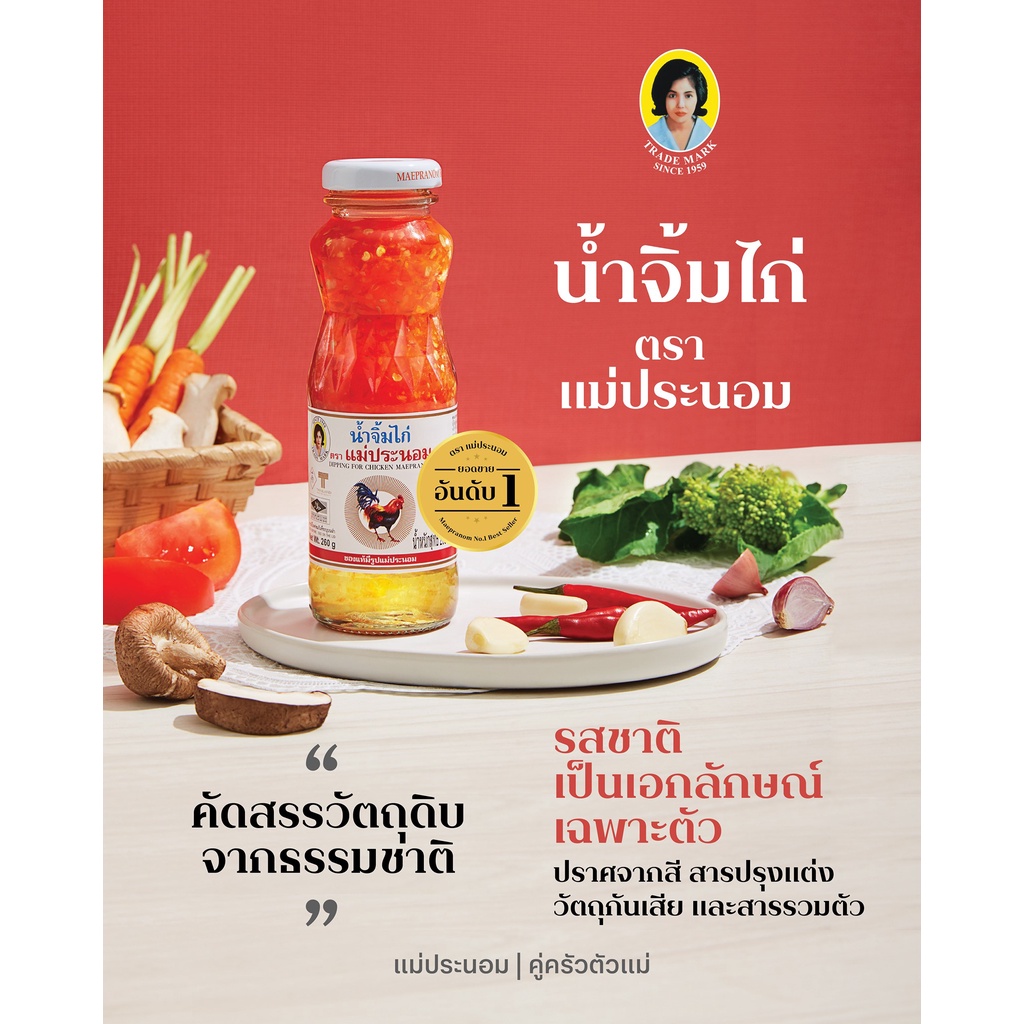 น้ำจิ้มไก่ แม่ประนอม 1 กิโลกรัม รสชาติหวาน เค็ม เผ็ด กลิ่นหอม และกลมกล่อม ตามสูตรเฉพาะตราแม่ประนอม