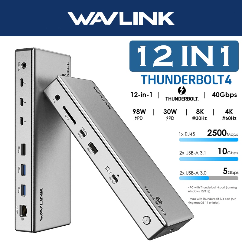 WAVLINK 12 IN 1 Thunderbolt4 แท่นชาร์จแล็ปท็อป 98W หน้าจอ 8K@30Hz 10Gbps USB3.1 ช่องเสียบการ์ด SD 2.5G อีเธอร์ เน็ต