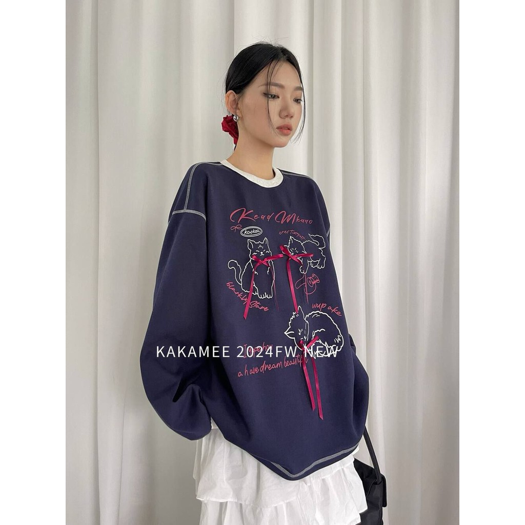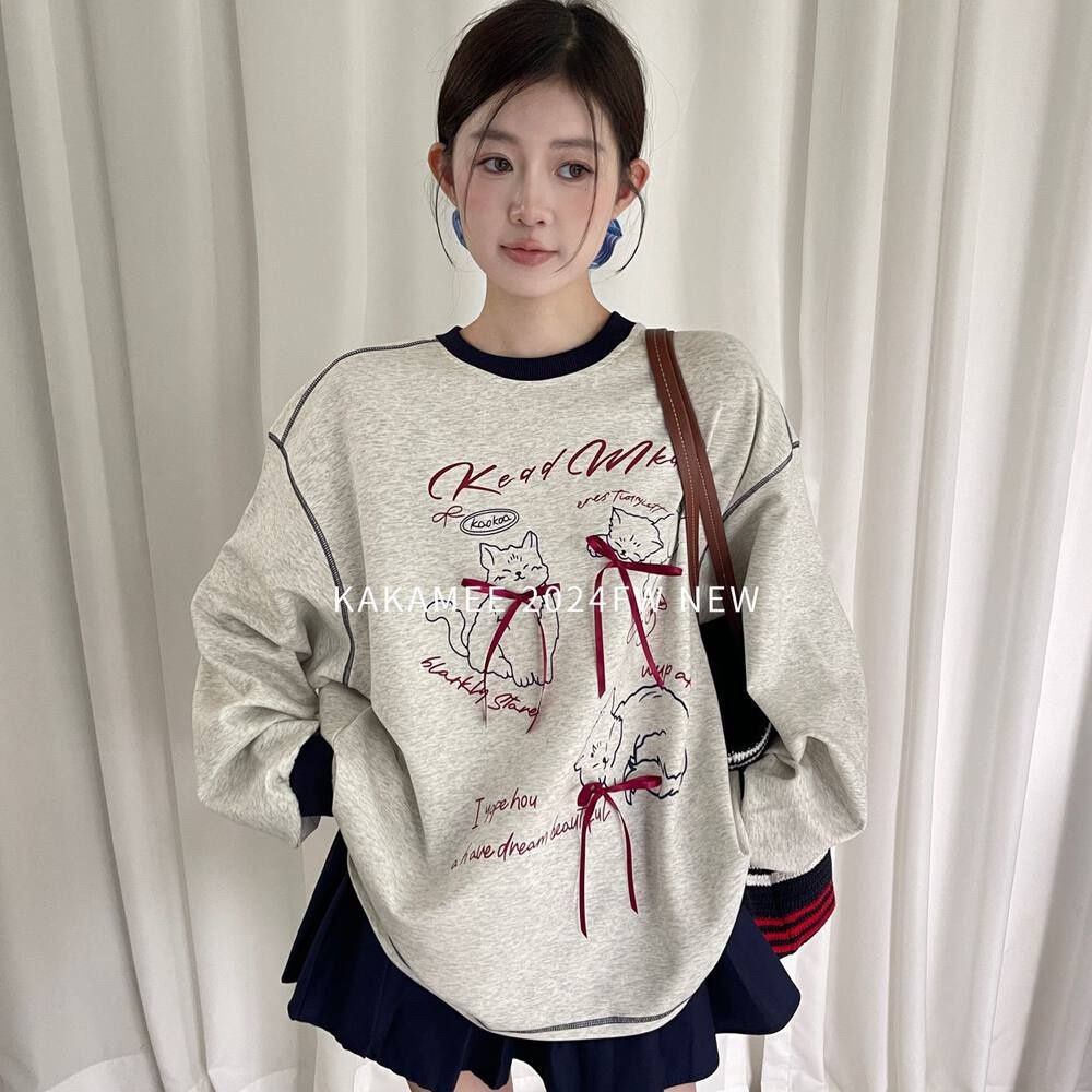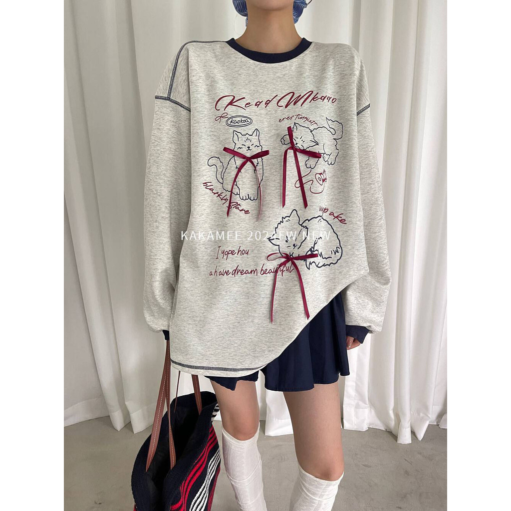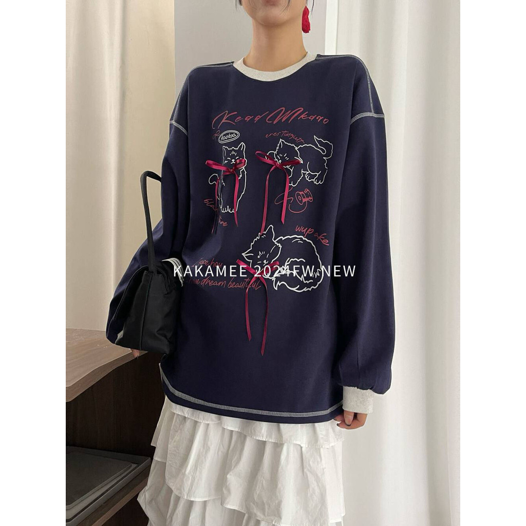 การ์ตูนการ์ตูนแมวพิมพ์โบว์เสื้อแขนยาวผู้หญิงฤดูใบไม้ร่วงสไตล์ใหม่หลวมด้านบน