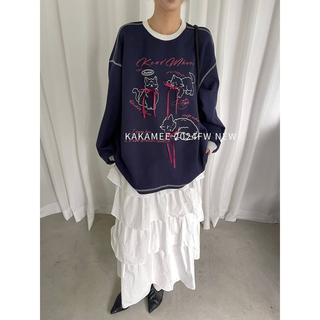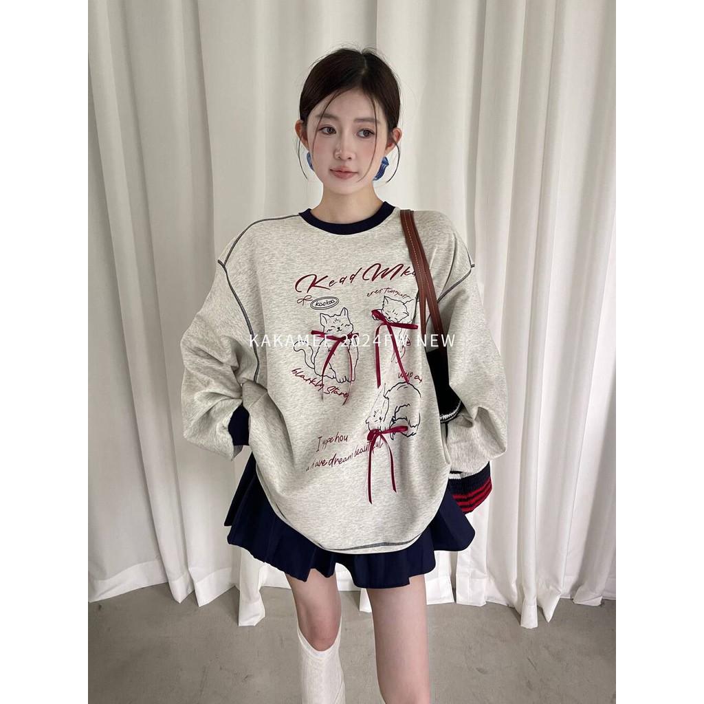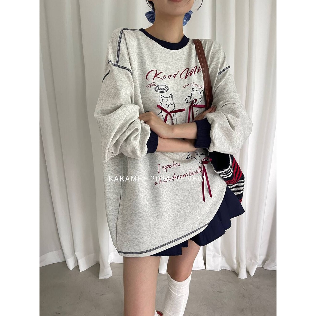 การ์ตูนการ์ตูนแมวพิมพ์โบว์เสื้อแขนยาวผู้หญิงฤดูใบไม้ร่วงสไตล์ใหม่หลวมด้านบน