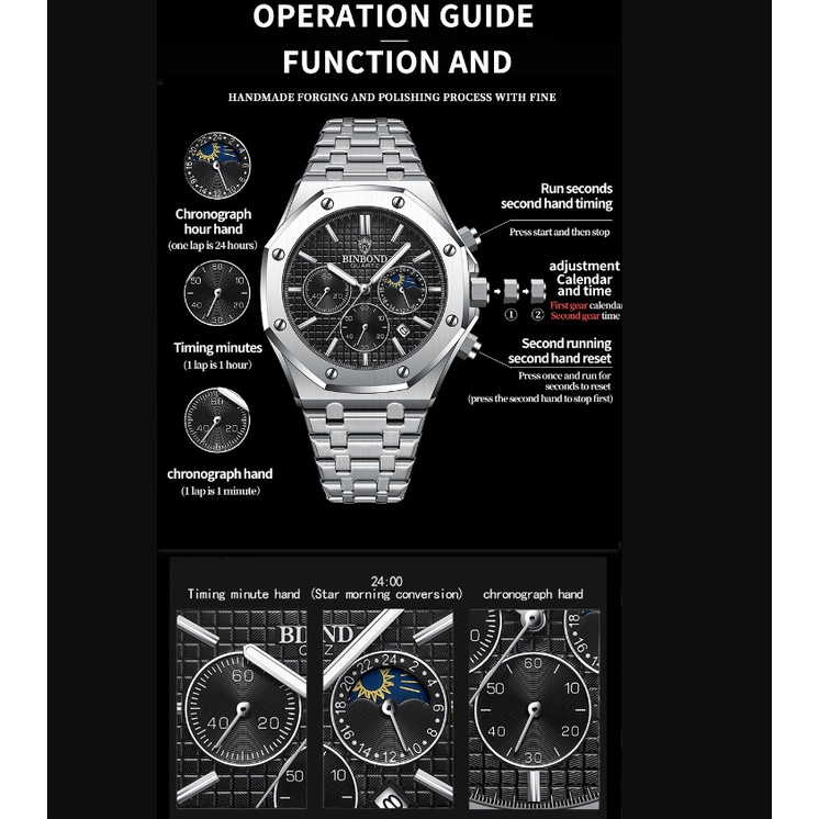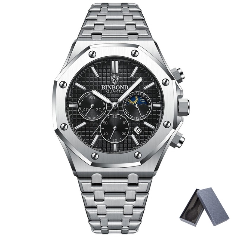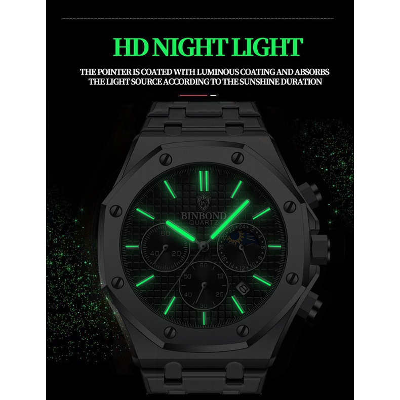 Binbond นาฬิกาของแท้เดิมเทรนด์ธุรกิจผู้ชายนาฬิกาควอตซ์สแตนเลสสายนาฬิกาเรืองแสงนาฬิกากันน้ำมัลติฟังก์ชั่โครโนกราฟปฏิทินผู้ชายแฟชั่นนาฬิกาควอตซ์ + กล่อง