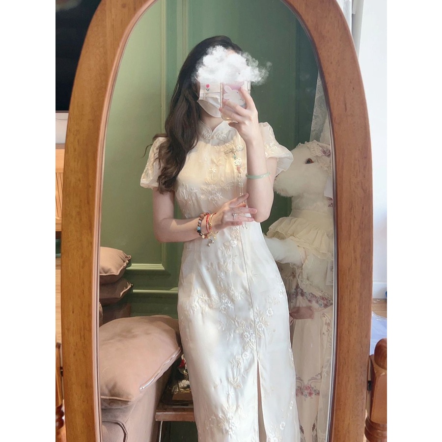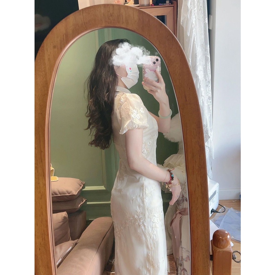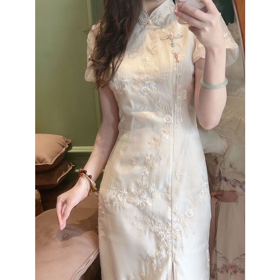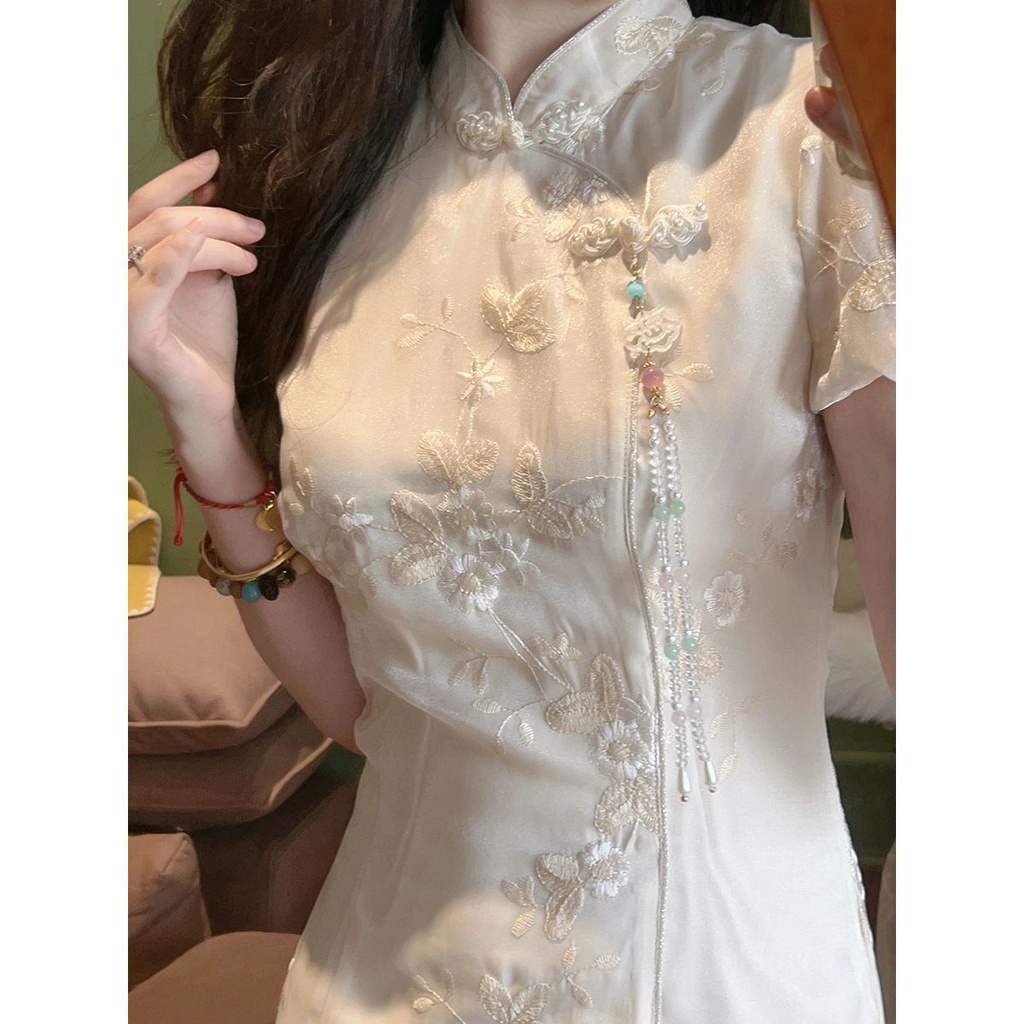 ชุดเดรสกี่เพ้า ปักลาย สีขาว สไตล์จีนเรโทร