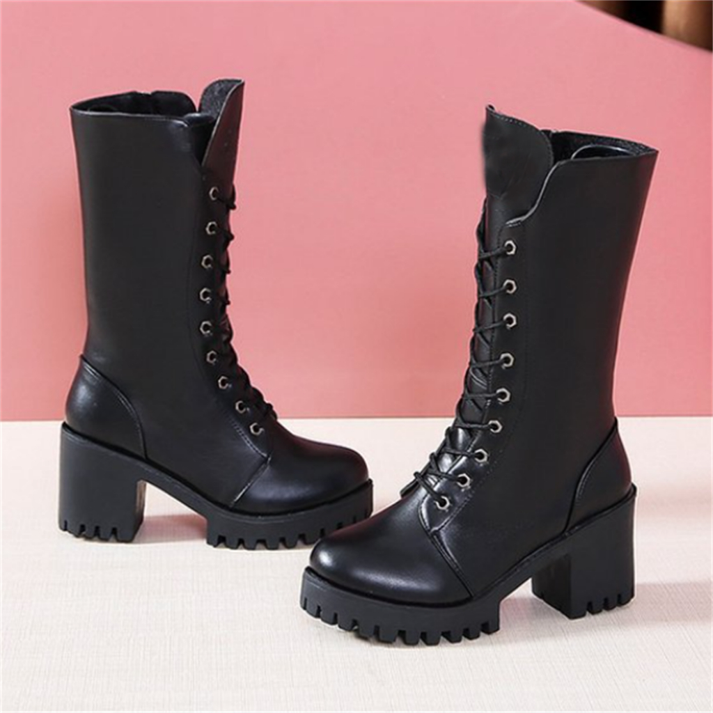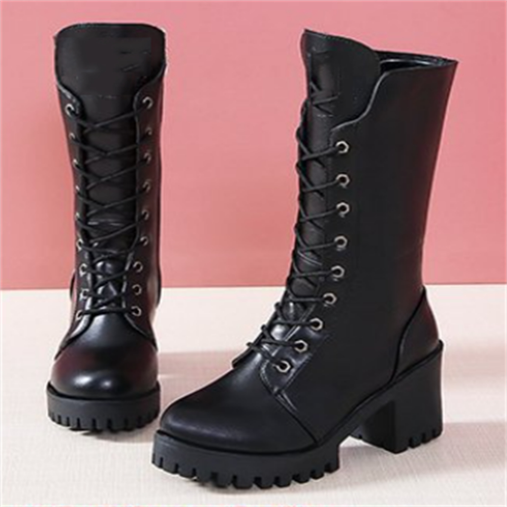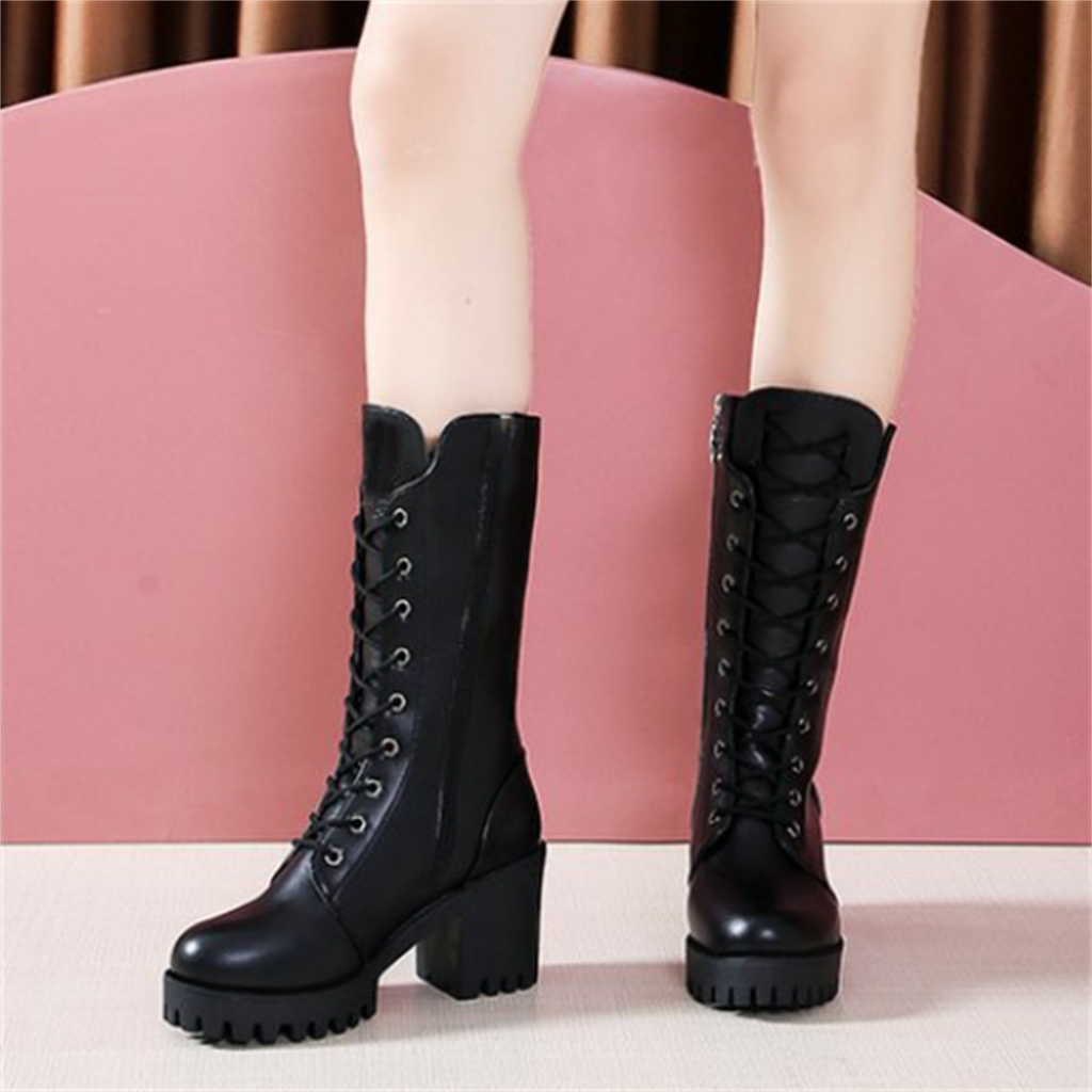 ขนาด 35-41 รองเท้าฤดูใบไม้ร่วงและฤดูหนาวใหม่ลูกไม้ขึ้นอิงลอนลมส้นสูงรองเท้าอัศวินขนาดกลาง