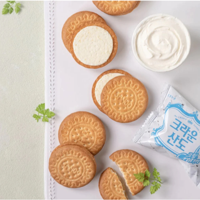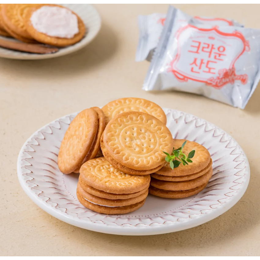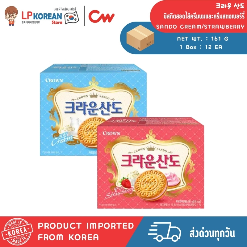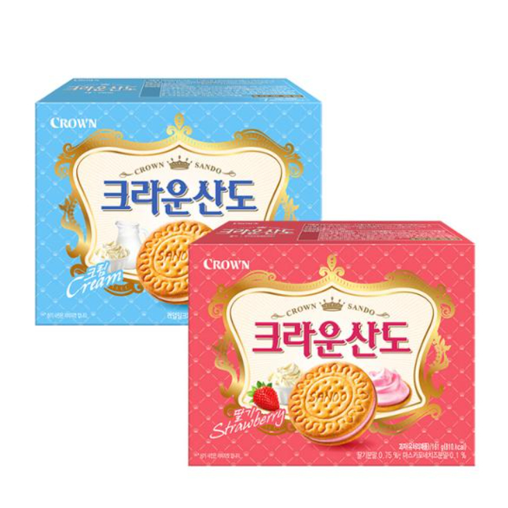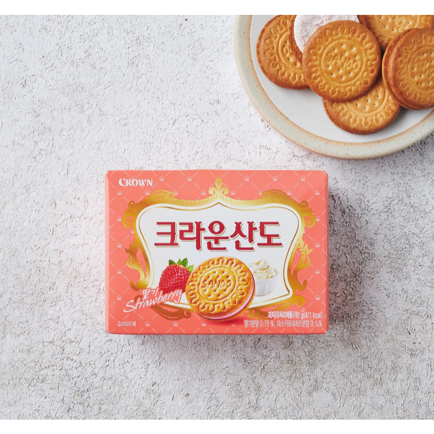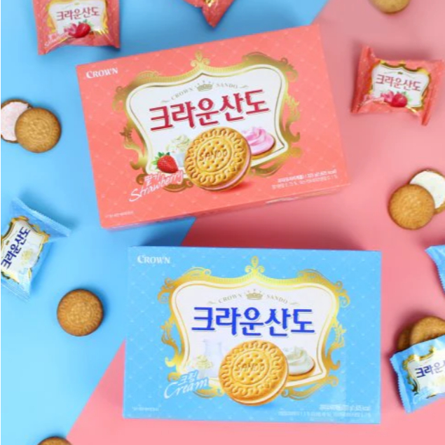 คราว์ ซันโด บิสกิตสอดไส้ครีมนมและครีมสตอเบอร์รี่ CROWN SANDO CREAM/STRAWBERRY 크라운 산도