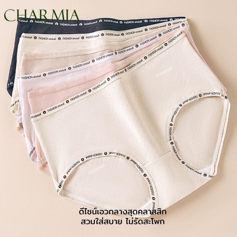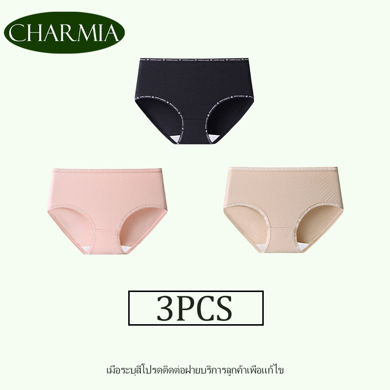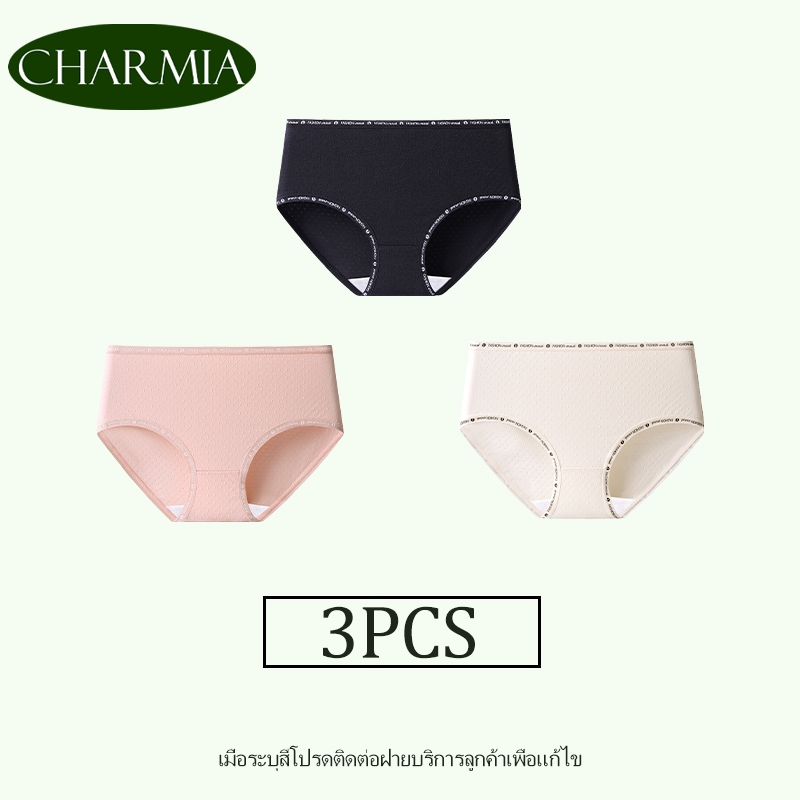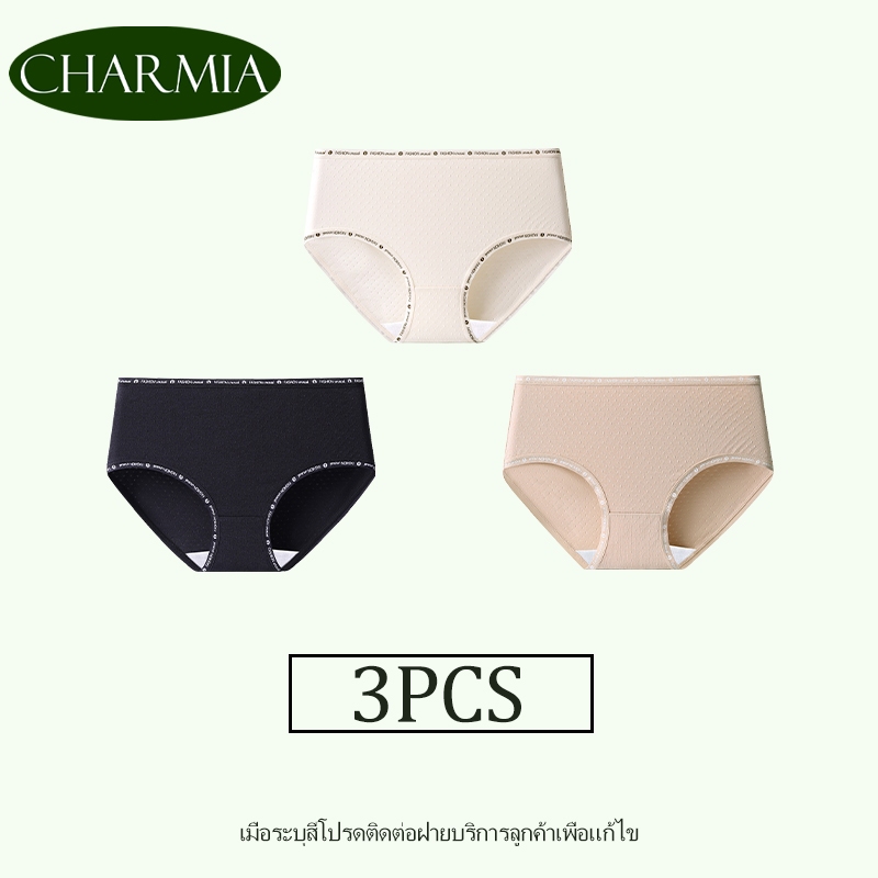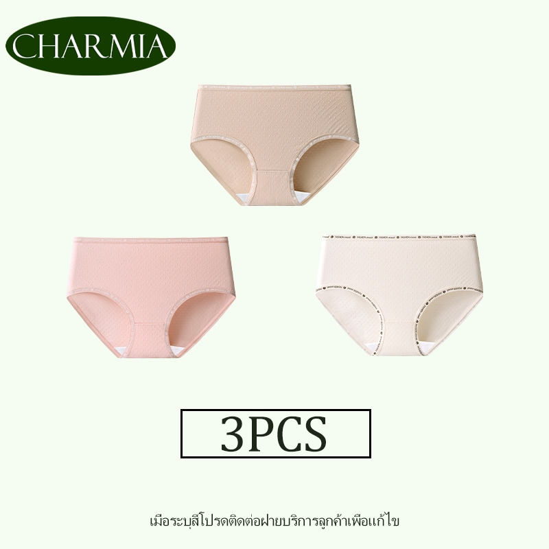 (Thailand Stock)Charmia(3PCS) กางเกงในหญิงเอวกลาง ผ้าฝ้ายแท้ ซับในฆ่าเชื้อ 5A เอวพิมพ์ลาย ไม่บั้นก้น
