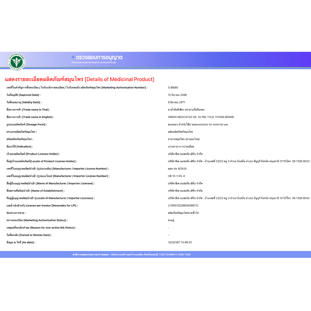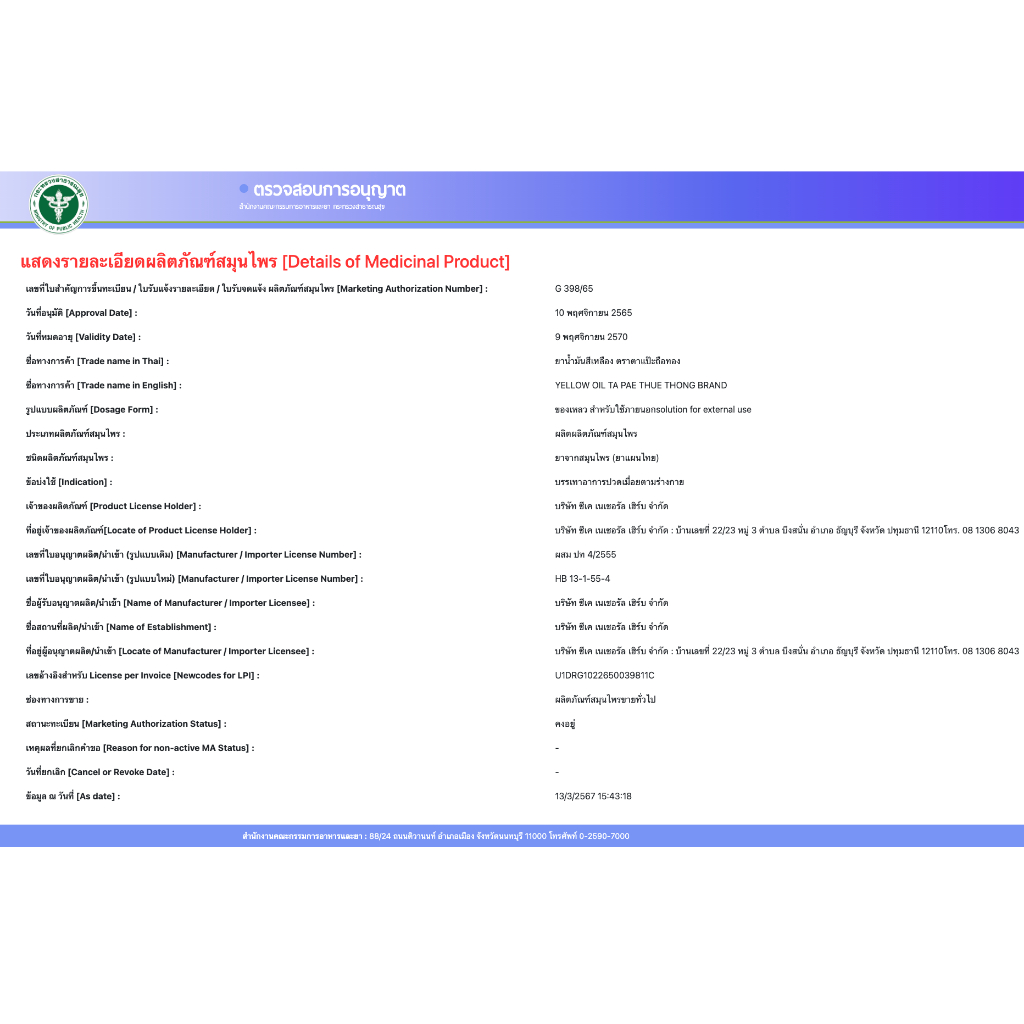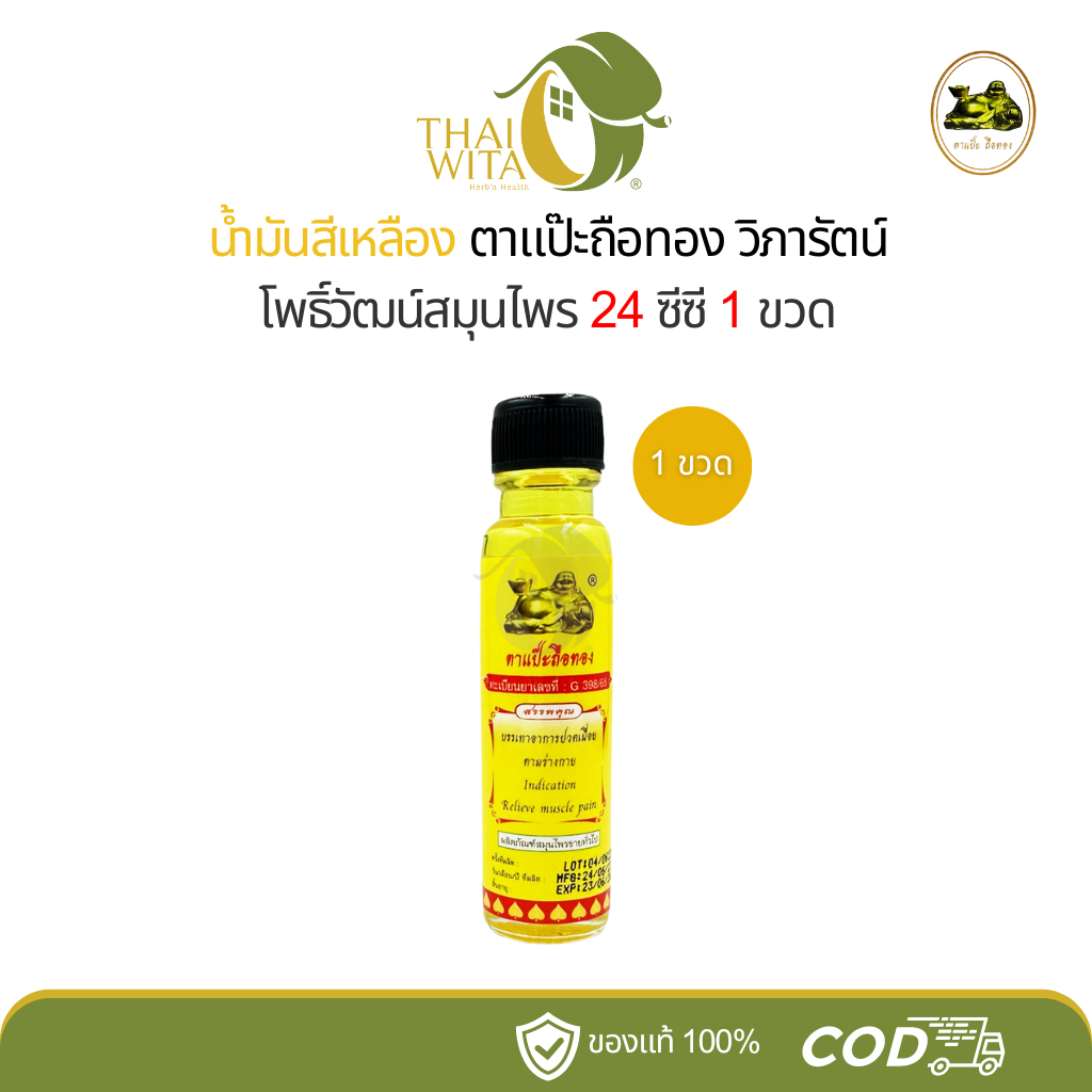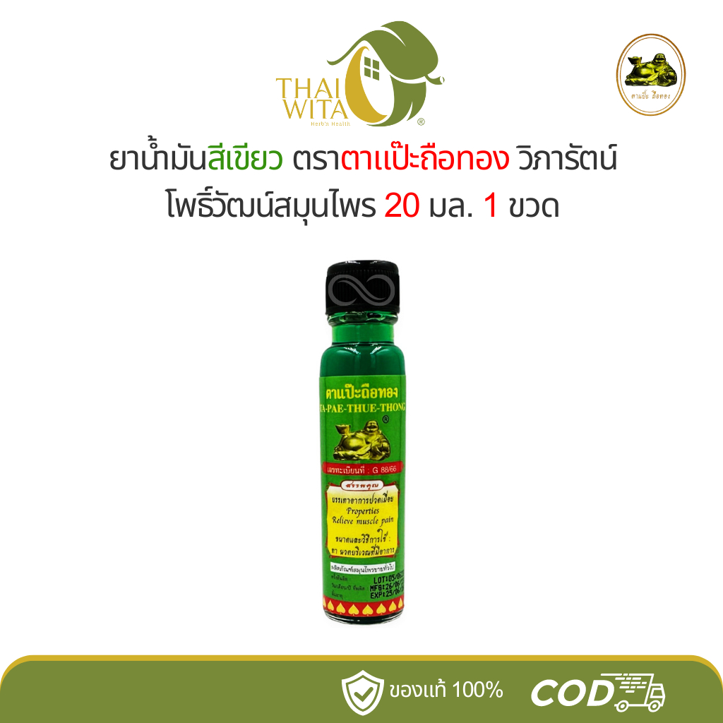 (1ขวด/2ขวด) น้ำมันเขียว/น้ำมันเหลือง ตาแป๊ะยิ้มนอน ตาแป๊ะถือทอง โพธิ์วัฒน์สมุนไพร 20 มล.