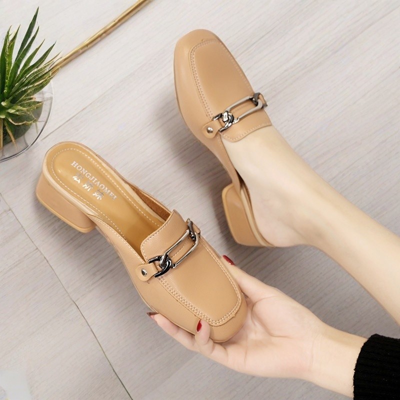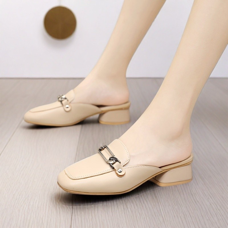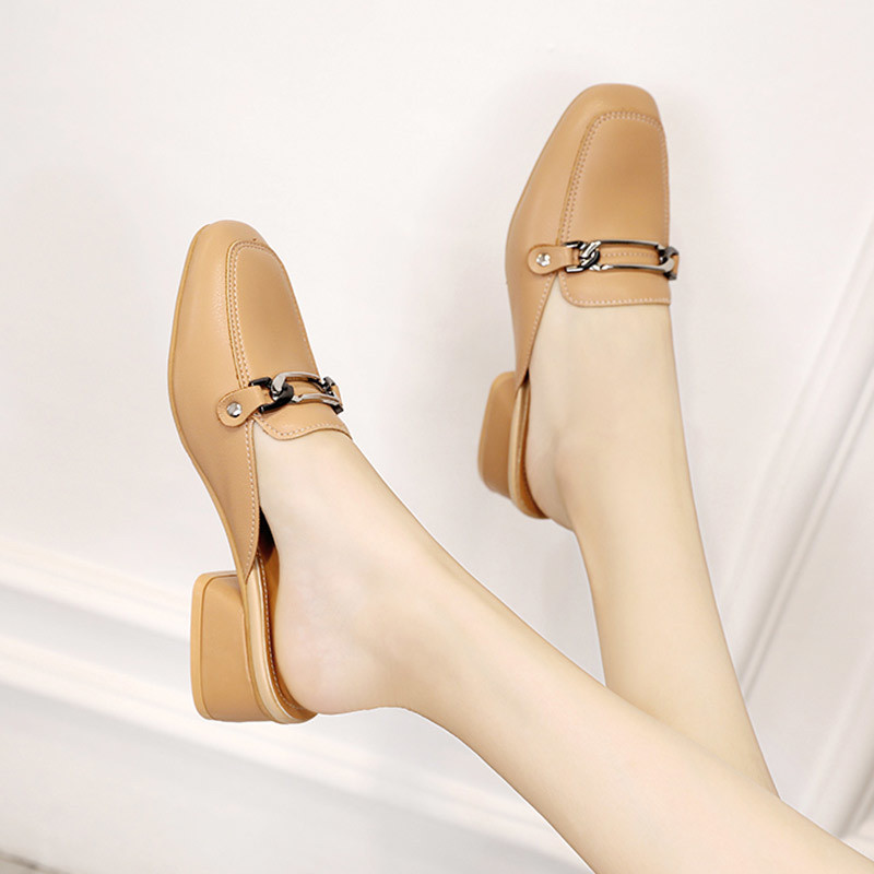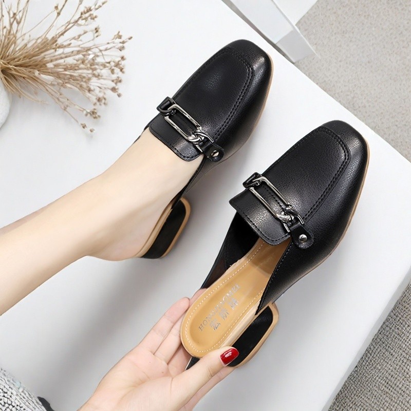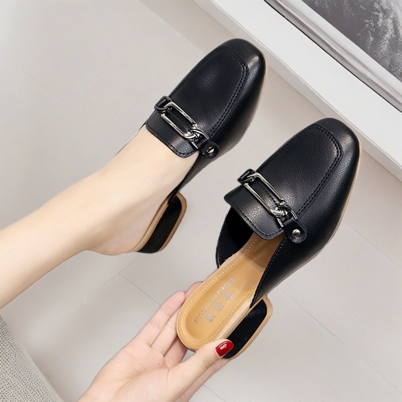 Baotou รองเท้าแตะครึ่งผู้หญิงสวมใส่ด้านนอก 2025 สไตล์ใหม่สแควร์ Toe ส้นหนา Mules สบาย All-Match ขนาดเล็กส้นต่ําขี้เกียจ Sli