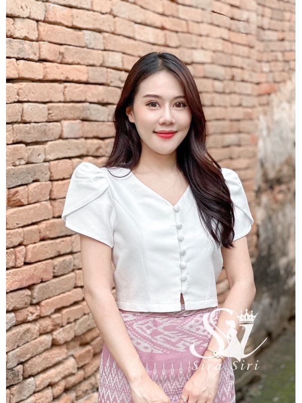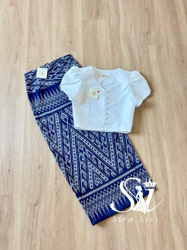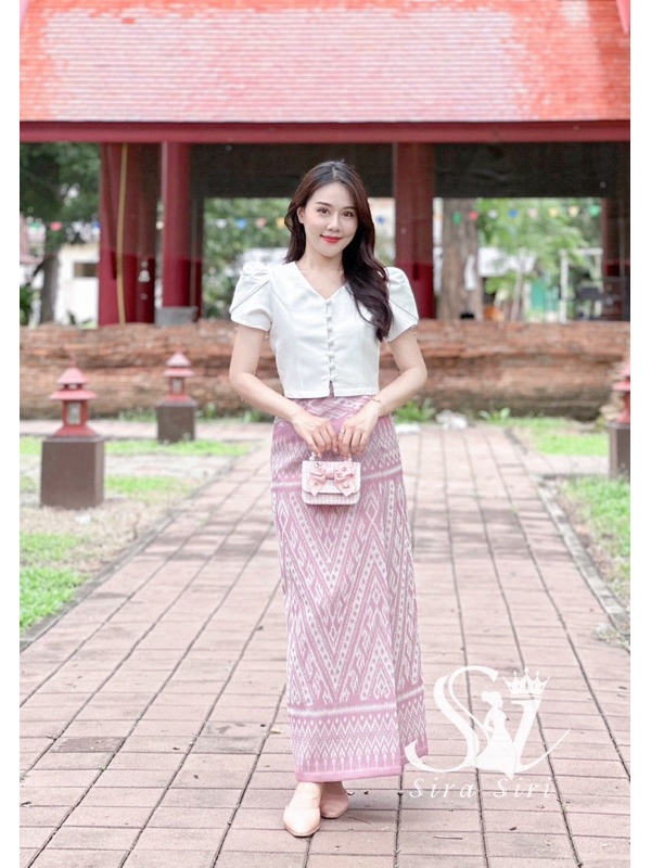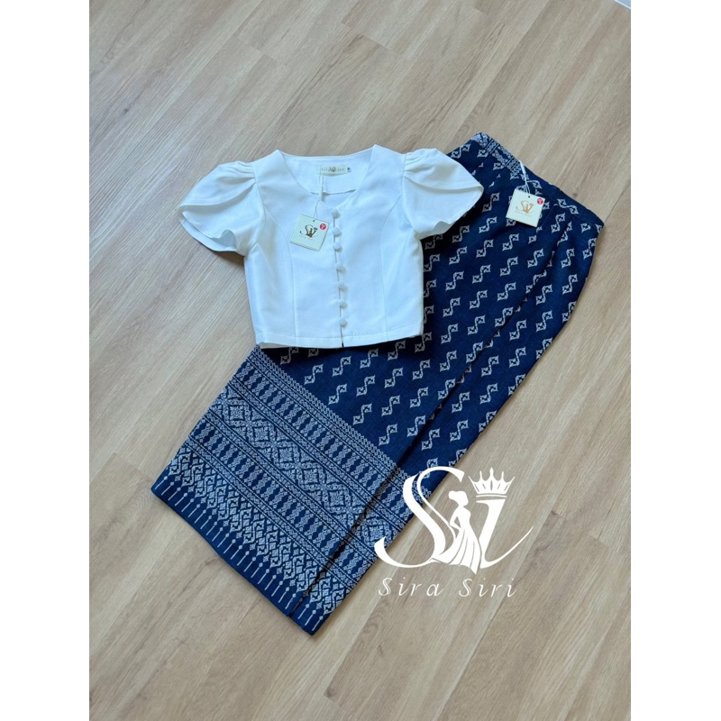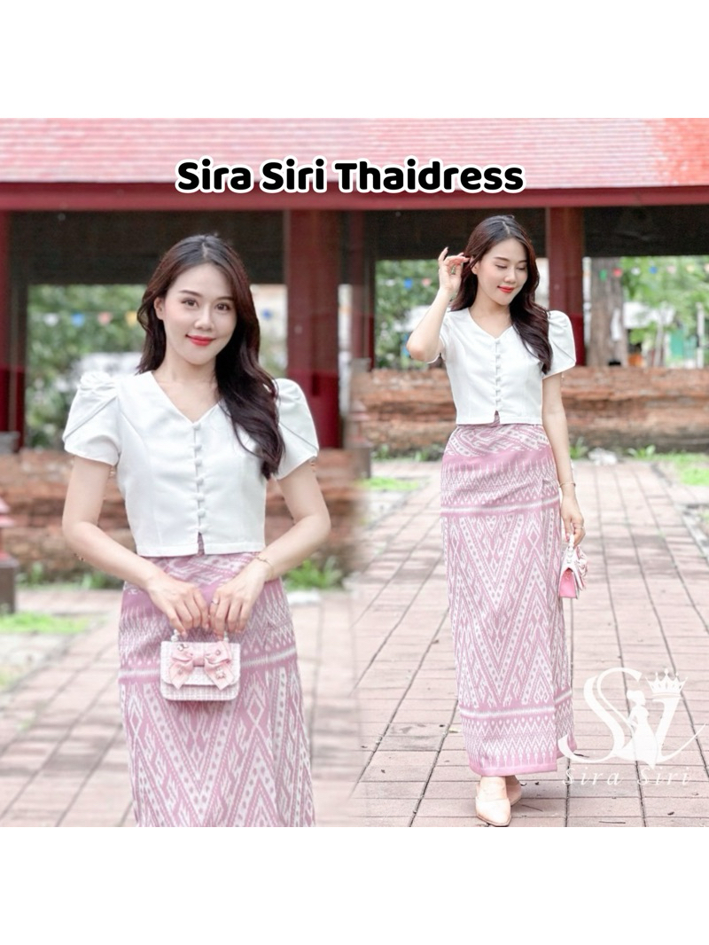 Sira Siri ชุดไทยเสื้อผ้าไหมอิตาลี คอวีทรงครอป ดีเทลแขนดอกบัว ผ้าถุงเนื้อผ้าฝ้ายทอลาย ทอเครื่องสวยๆ