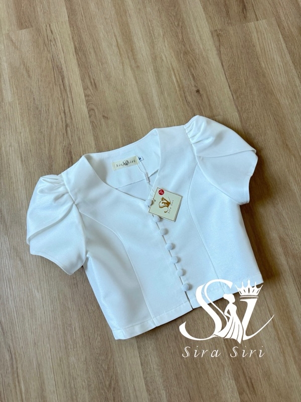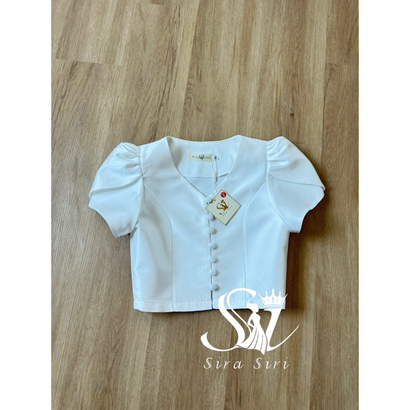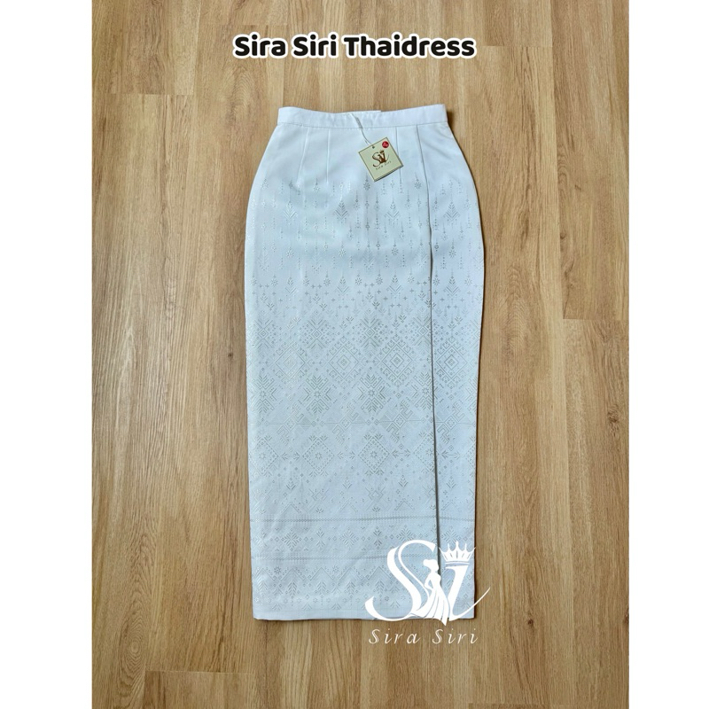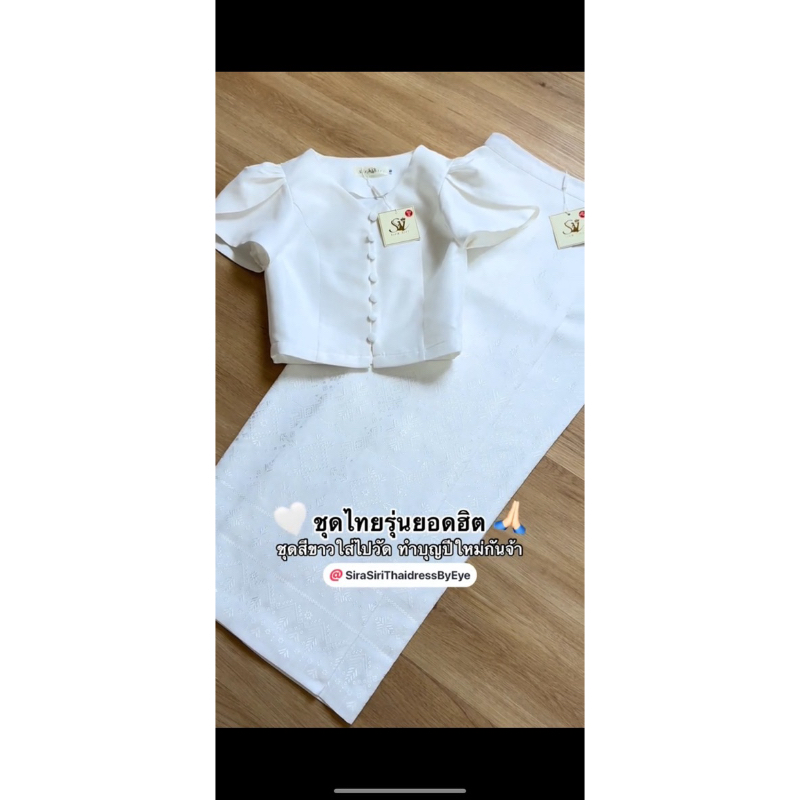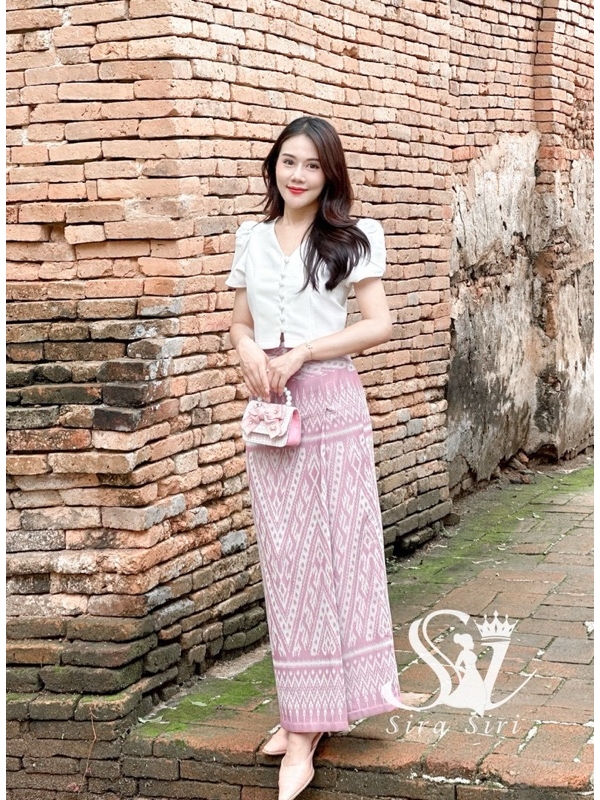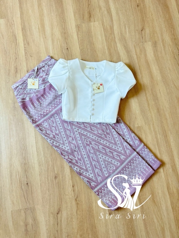Sira Siri ชุดไทยเสื้อผ้าไหมอิตาลี คอวีทรงครอป ดีเทลแขนดอกบัว ผ้าถุงเนื้อผ้าฝ้ายทอลาย ทอเครื่องสวยๆ