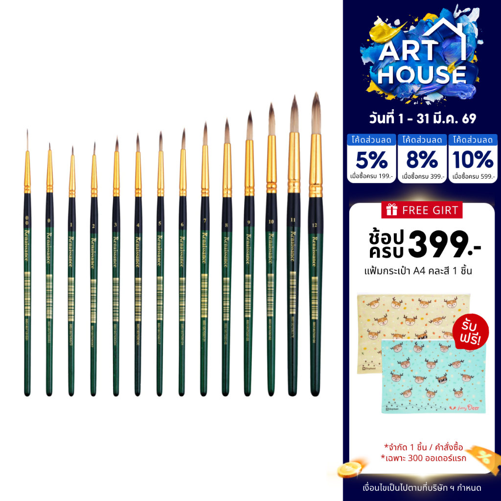 Renaissance (เรนาซองซ์) พู่กัน พู่กันสีน้ำ ชนิดหัวกลม เบอร์ 0 - เบอร์ 6 จำนวน 1 ด้าม