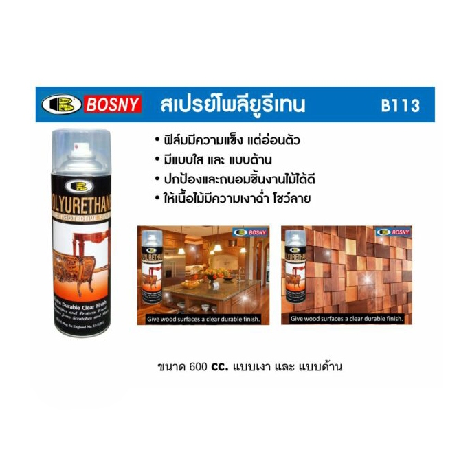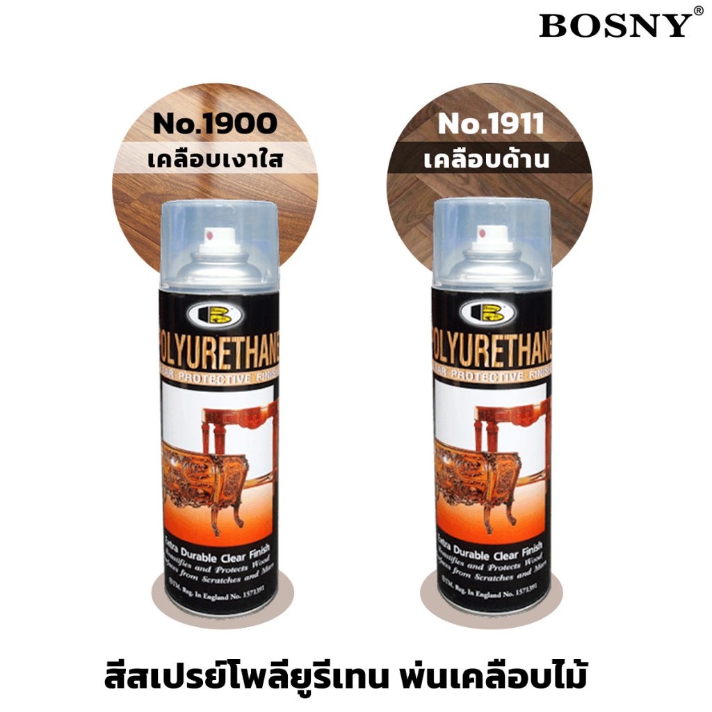 Bosny สเปรย์โพลียูรีเทน พ่นเคลือบไม้ ขนาด 600ml. Polyurethane No.1900 GLOSS No.1911 MATT