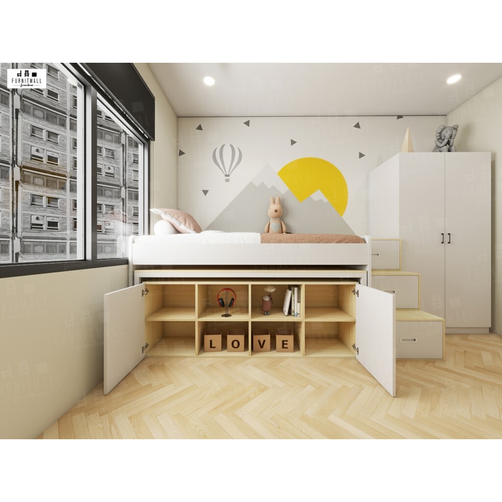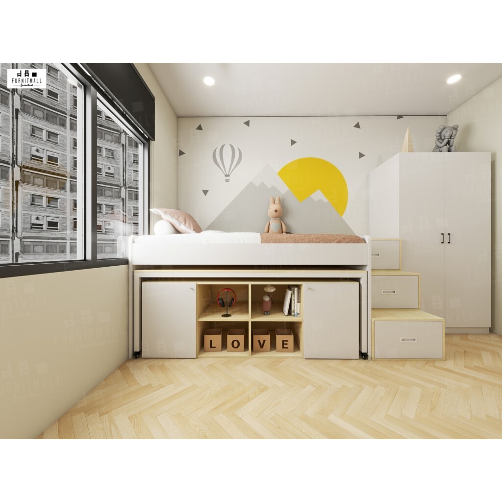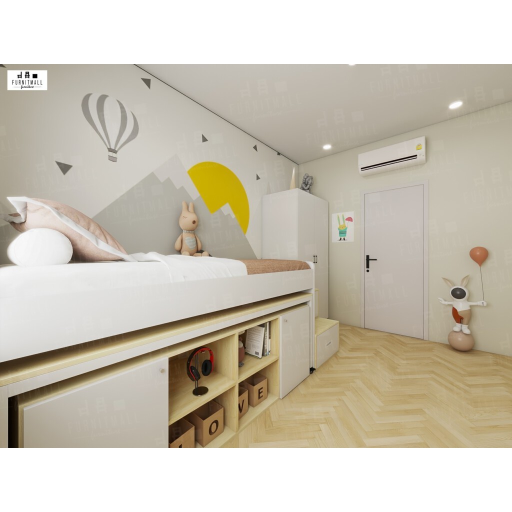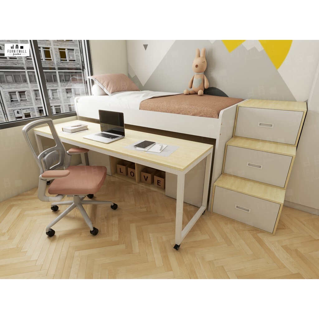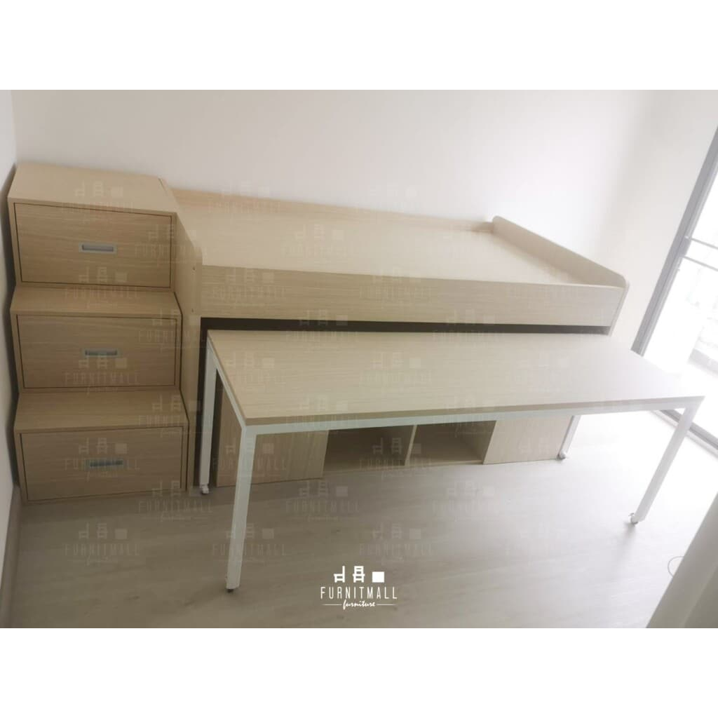 เตียงไม้มินิมอล3.5ฟุต ยกสูงพร้อมโต๊ะเหล็ก+ตู้+บันไดขึ้นข้าง