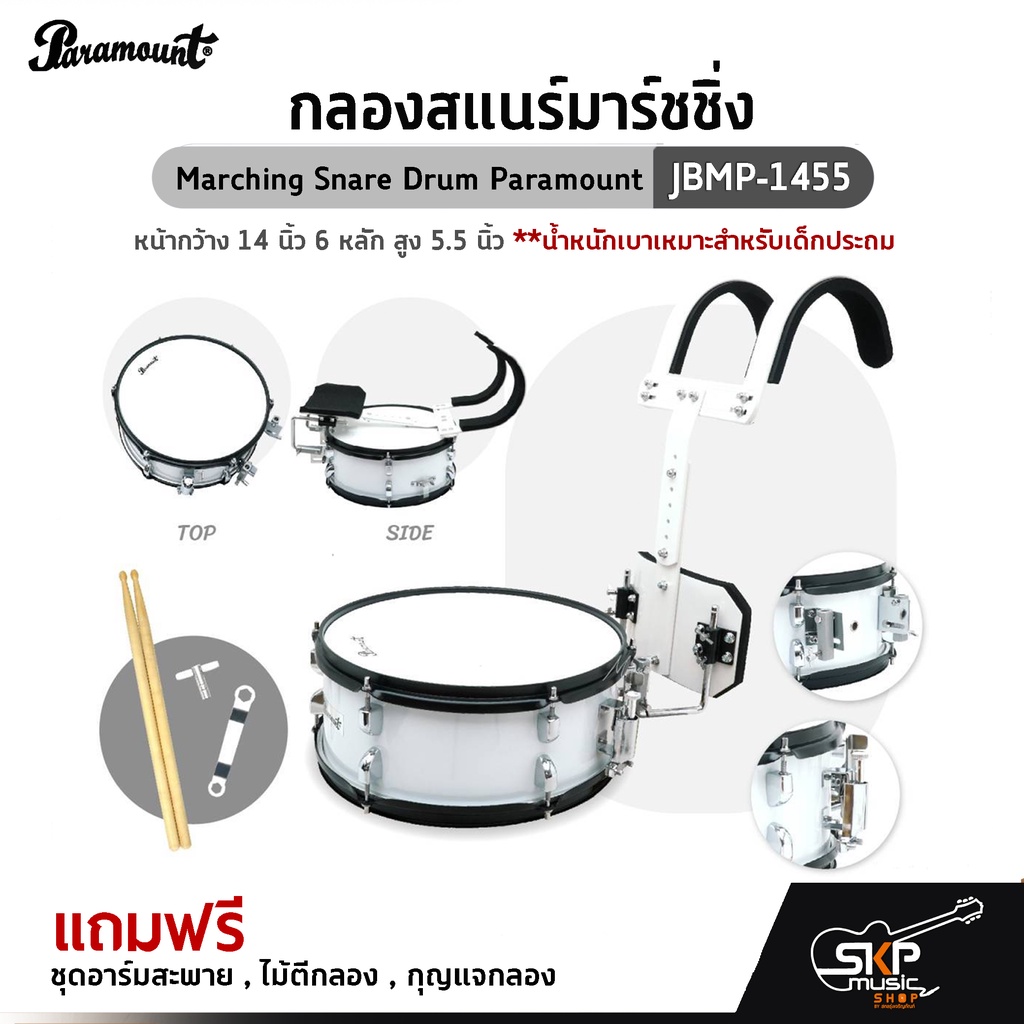 กลองสแนร์มาร์ชชิ่ง Marching Snare Drum Paramount JBMP-1455 หน้ากว้าง 14 นิ้ว 6 หลัก สูง 5.5 นิ้ว เหมาะสำหรับเด็กประถม