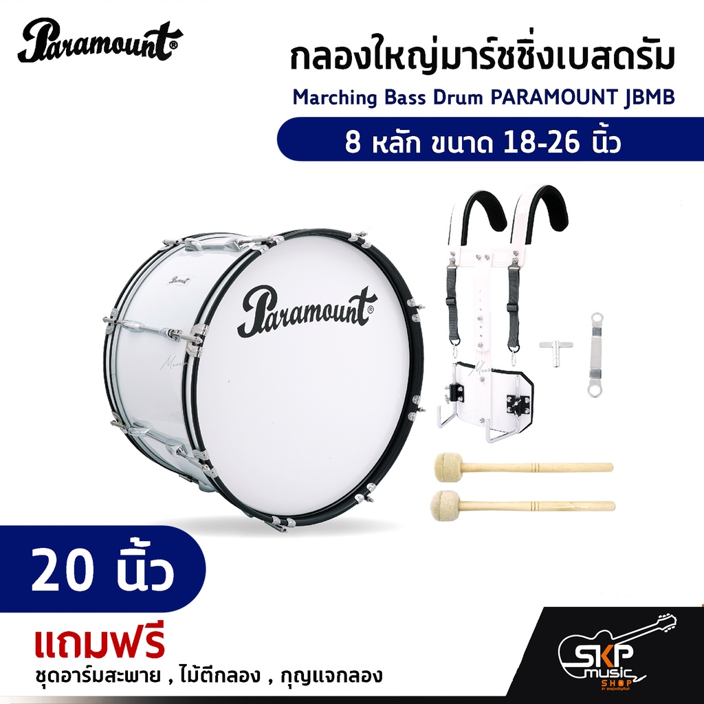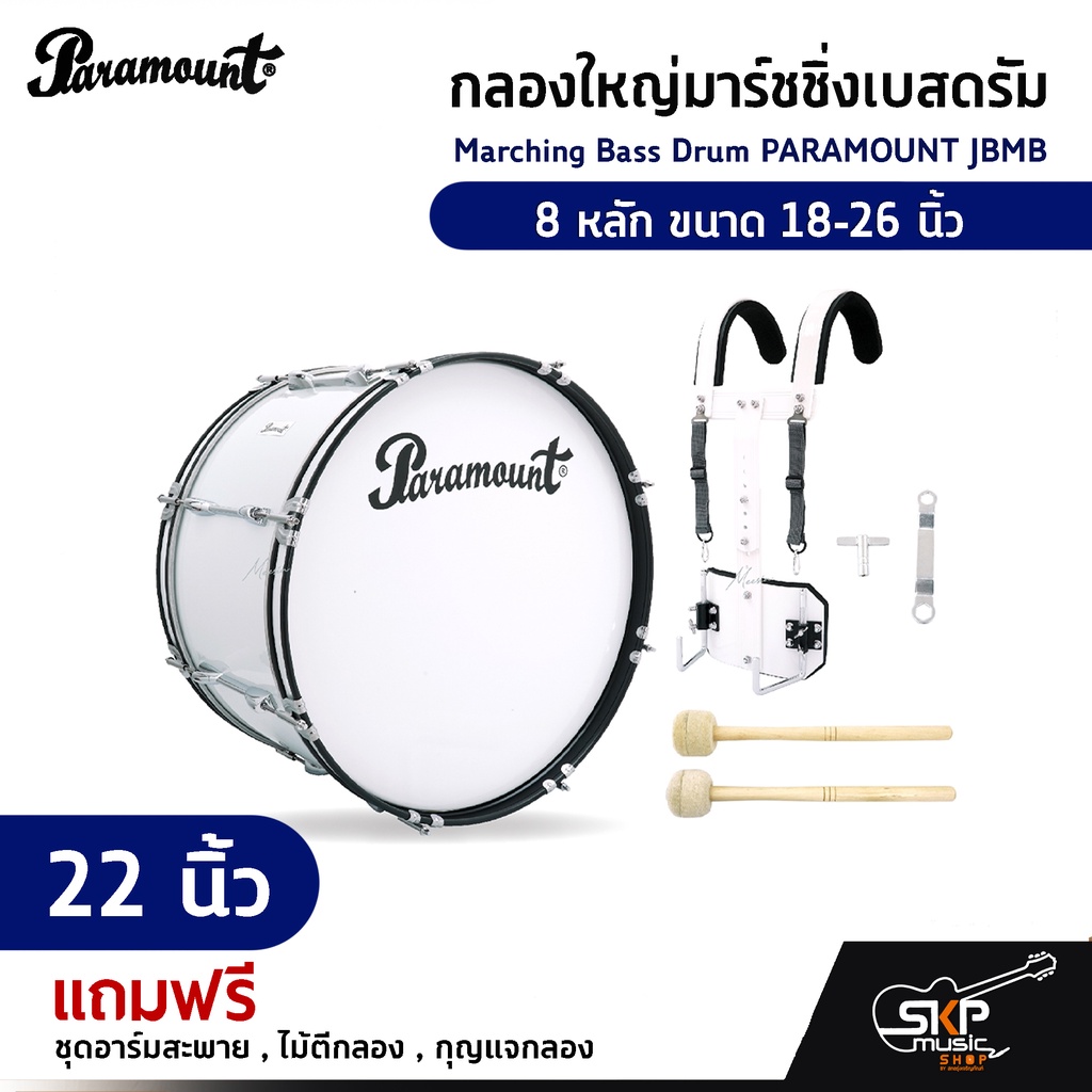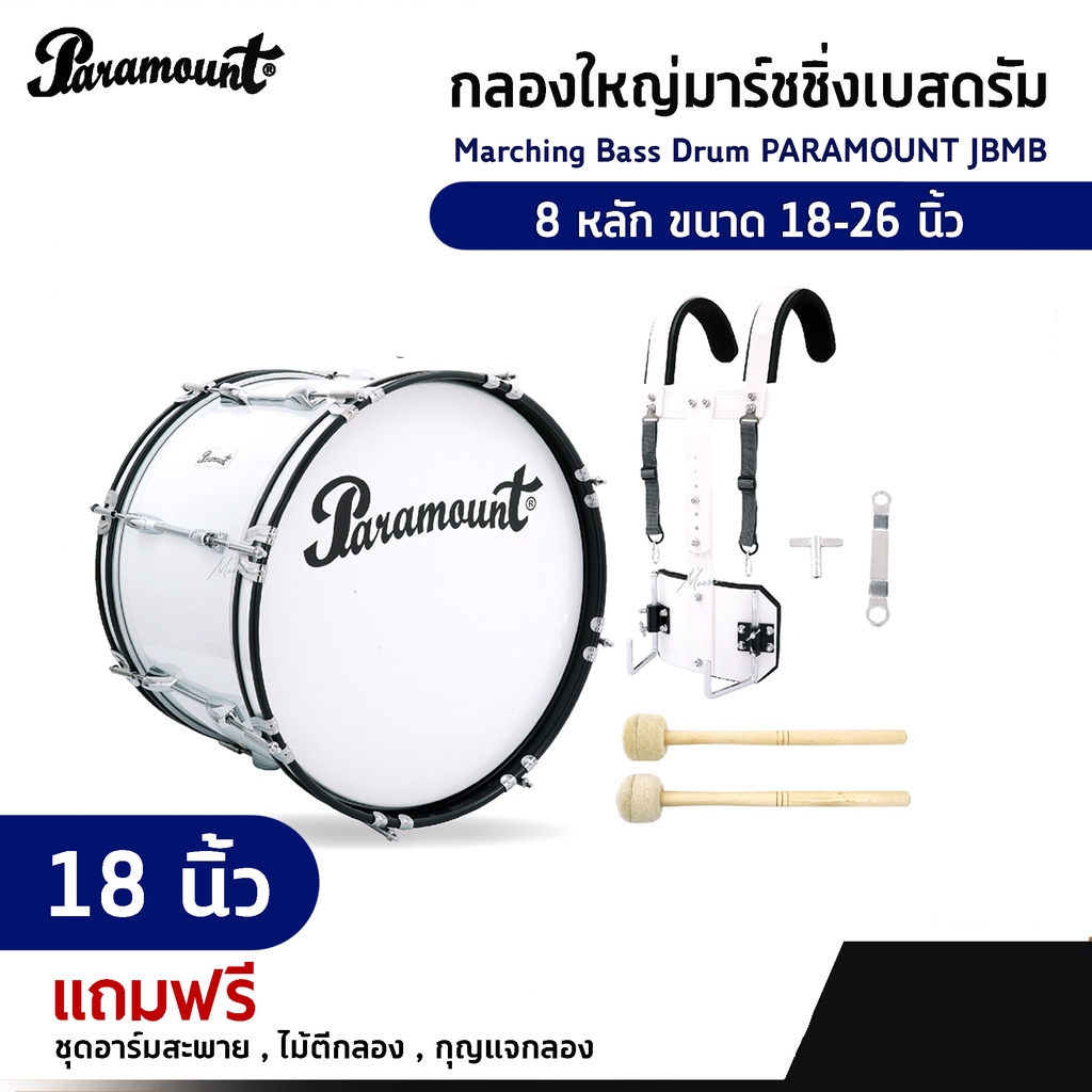 กลองใหญ่มาร์ชชิ่งเบสดรัม Marching Bass Drum PARAMOUNT JBMB 8 หลัก ขนาด 18-26 นิ้ว ของแถมชุดอาร์มสะพาย,ไม้ตีกลอง,กุญแจ