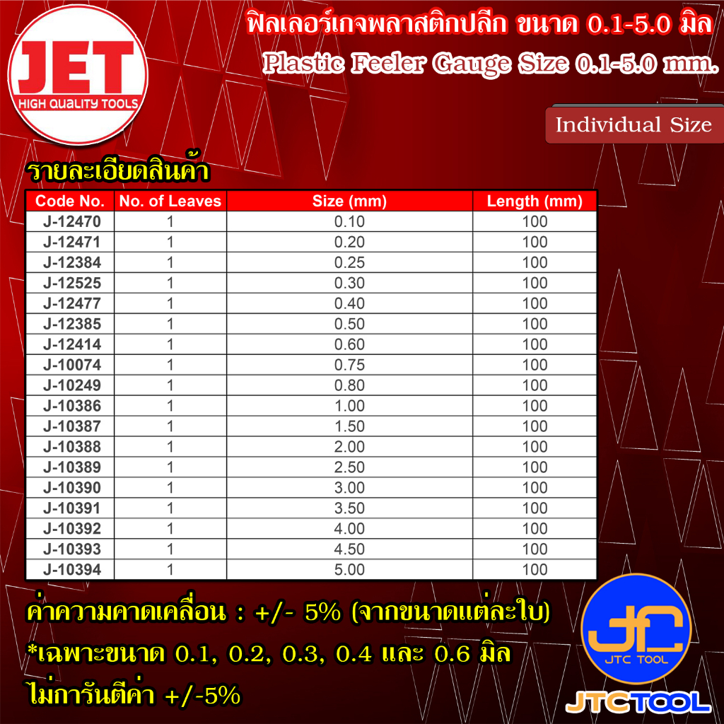 JET ฟิลเลอร์เกจพลาสติกแบบปลีก ขนาด 0.1-5.0 มิล - Plastic Feeler Gauge Individual Size 0.1-5.0 mm.