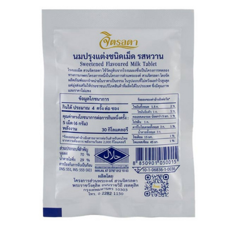 [1ซอง]นมอัดเม็ด รสชาติหวาน มัน กลมกล่อม อร่อย เคี้ยวเพลิน ผลิตโดย โครงการส่วนพระองค์ สวนจิตรลดา นมผงสวนดุสิต ขนาด 25กรัม
