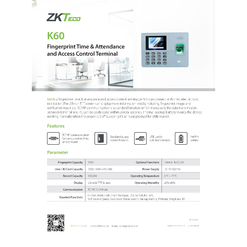 ⚡ส่งฟรี ส่งด่วน⚡ZKTeco K60 เครื่องสแกนลายนิ้วมือ ลงเวลาทำงาน ใช้งานง่าย เมนูภาษาไทย 100%