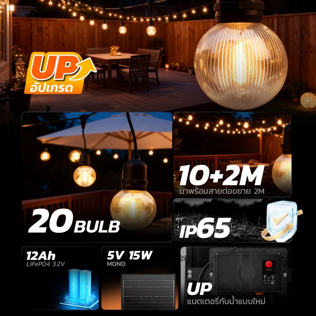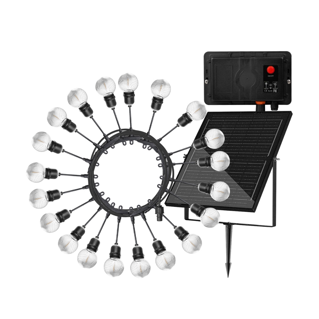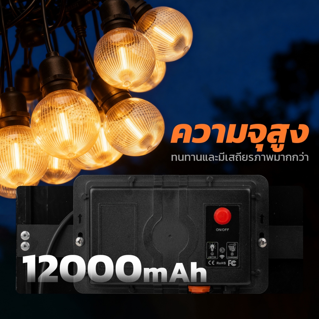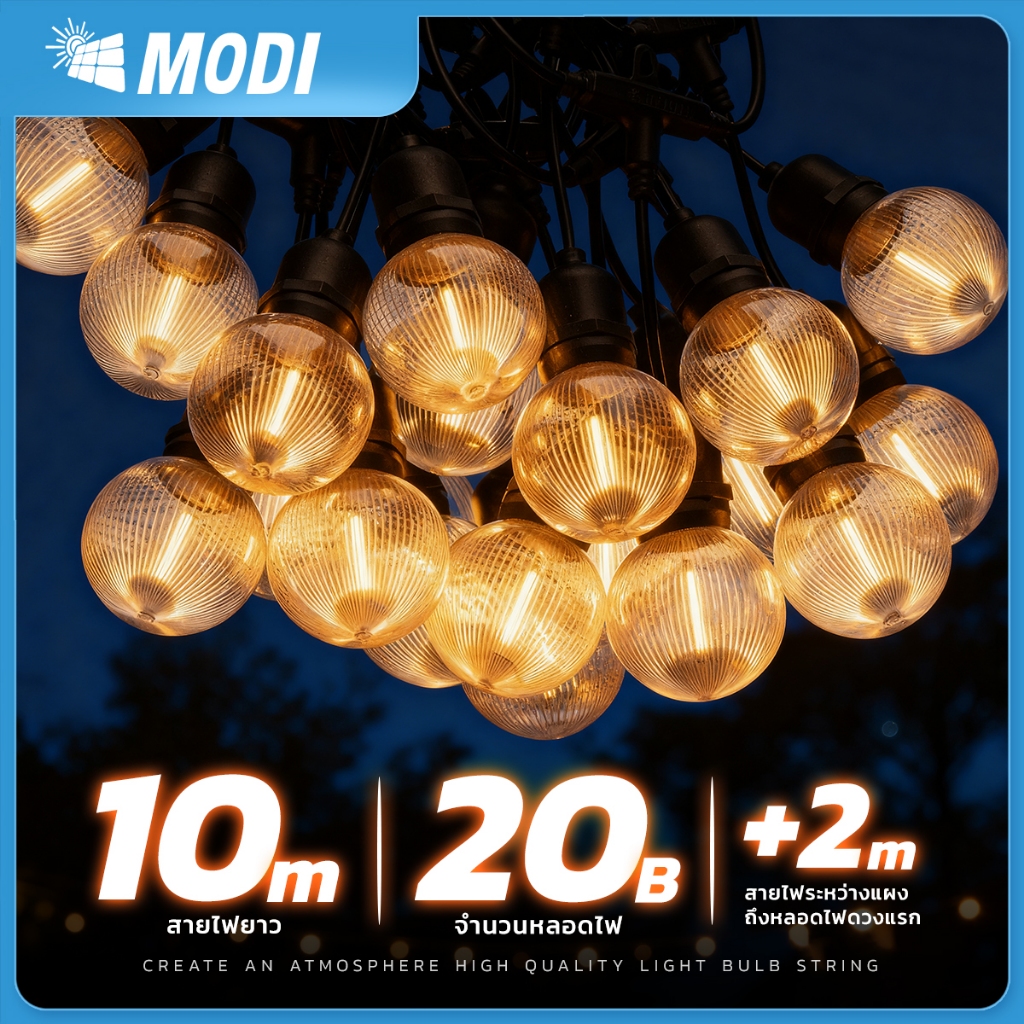 MODIไฟห้อยระย้าโซล่าเซลล์ ยาว10เมตร20หลอด แสงเหลืองสว่างค้าง ไ ฟปิงปองแต่งสวน ปีใหม่ คริสมาส ปาร์ตี้