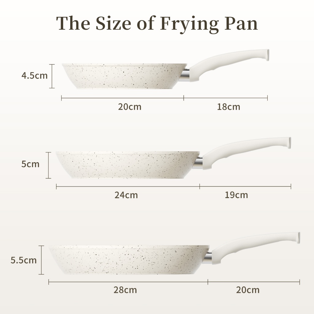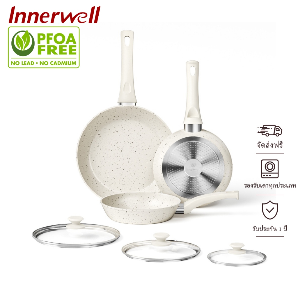 Innerwell 6 ชิ้นสีขาว กระทะเคลือบเซรามิก ทอดมีฝา ก้นแบน ไม่ติด ขนาด 20/24/28ซม.