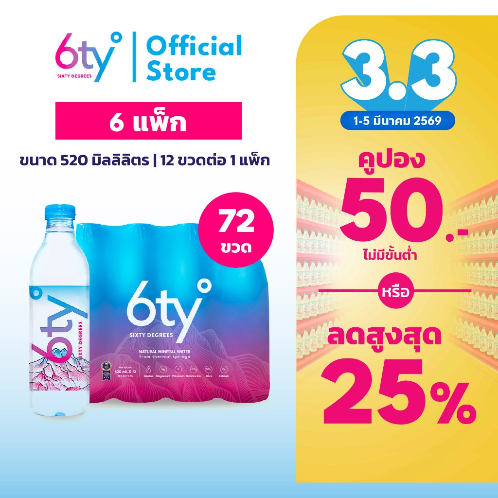 [ส่งฟรี] 520ml 6 แพ็ก 72 ขวด นํ้าแร่ 6ty Degrees Mineral Water น้ำแร่ธรรมชาติ 100% จากแหล่งน้ำแร่เชียงดาว