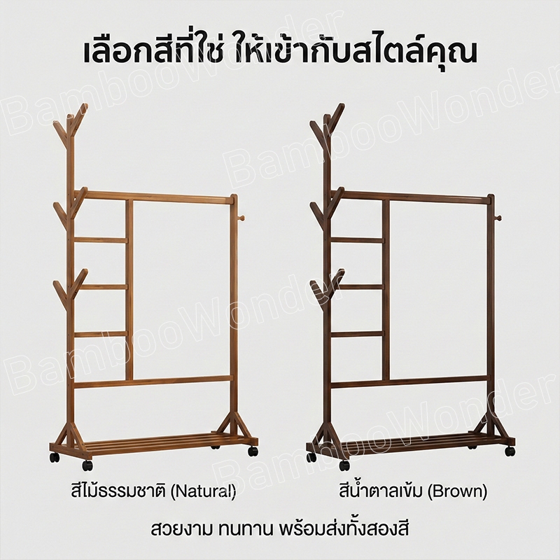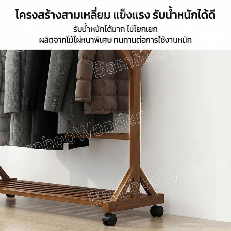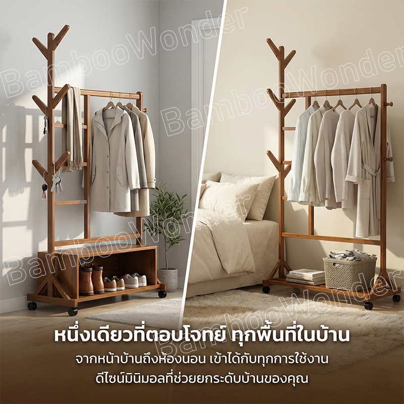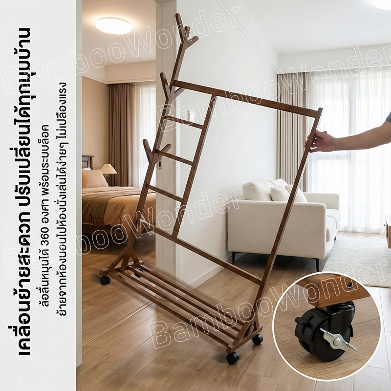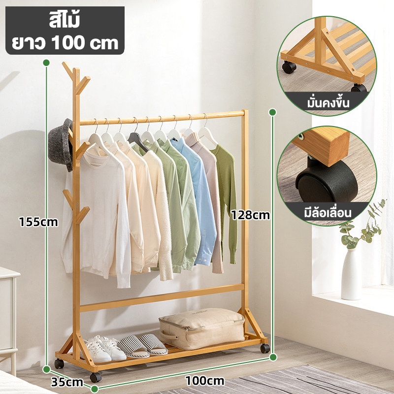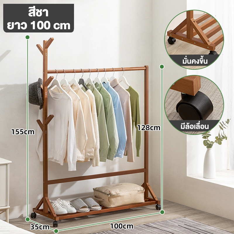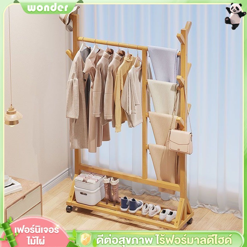 🔥 ราวแขวนเสื้ออเนกประสงค์ ราวตากผ้าไม้ พร้อมราวแขวนเสื้อ เเขวนหมวกและล้อลากหมุนได้ 360องศา