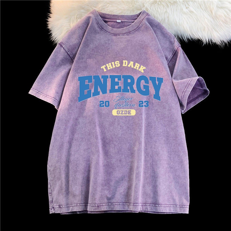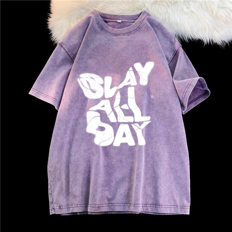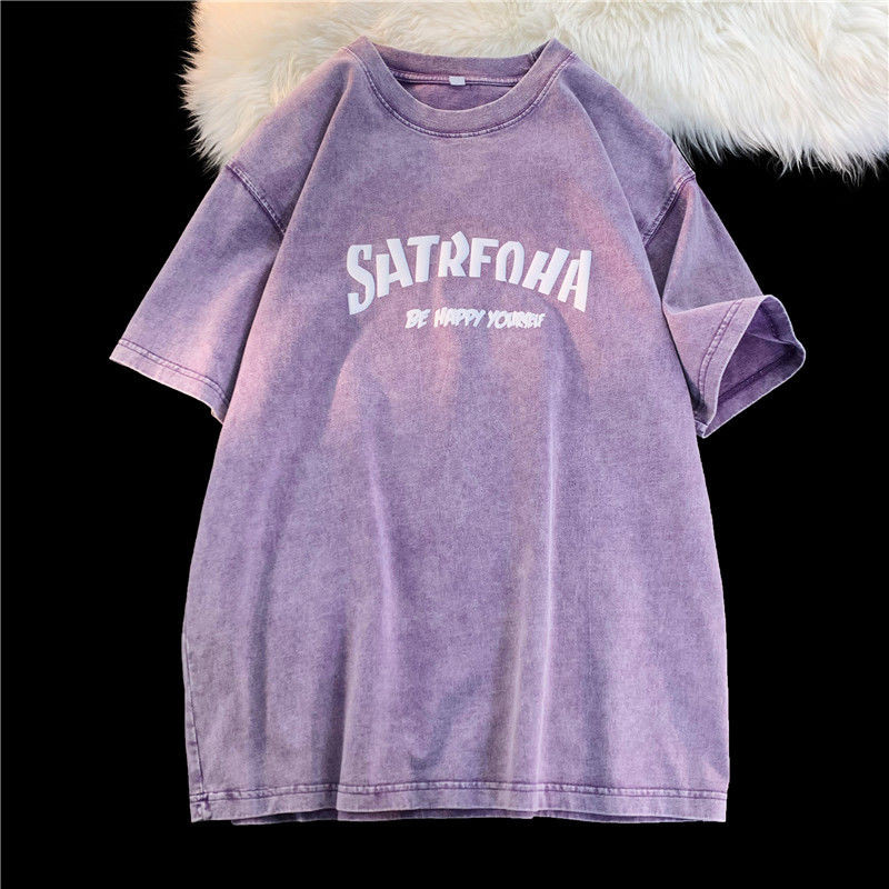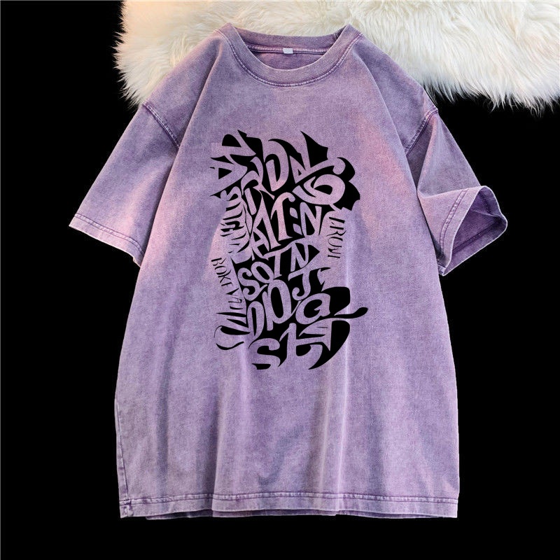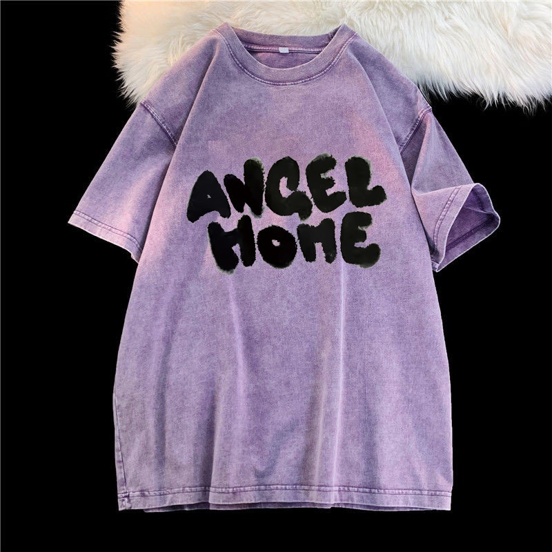 (จัดส่งตลอด 24 ชั่วโมง)Angle Official ล้างทำเก่าแขนสั้นเสื้อยืดผู้หญิงอเมริกันวินเทจยูโรสินค้าสีม่วงแขนครึ่งด้านบนที