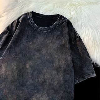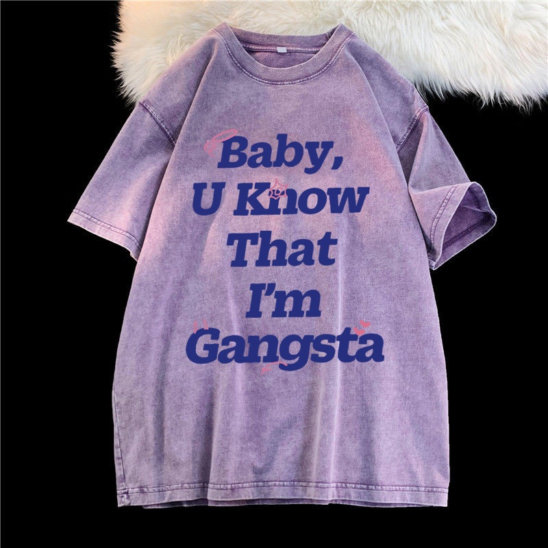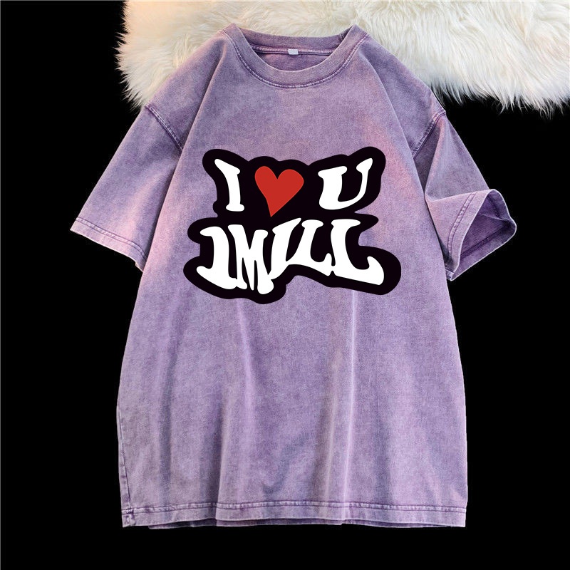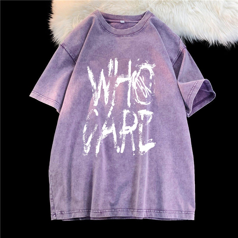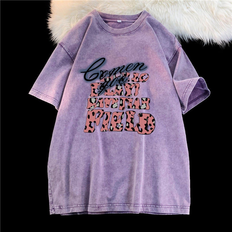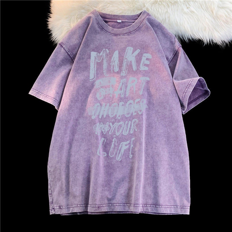 (จัดส่งตลอด 24 ชั่วโมง)Angle Official ล้างทำเก่าแขนสั้นเสื้อยืดผู้หญิงอเมริกันวินเทจยูโรสินค้าสีม่วงแขนครึ่งด้านบนที