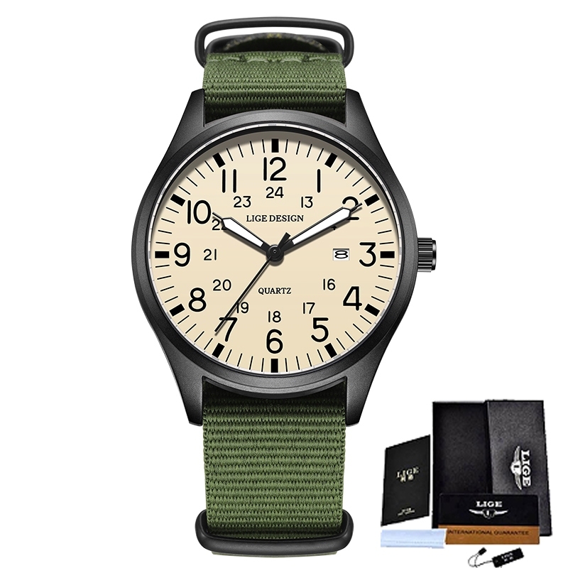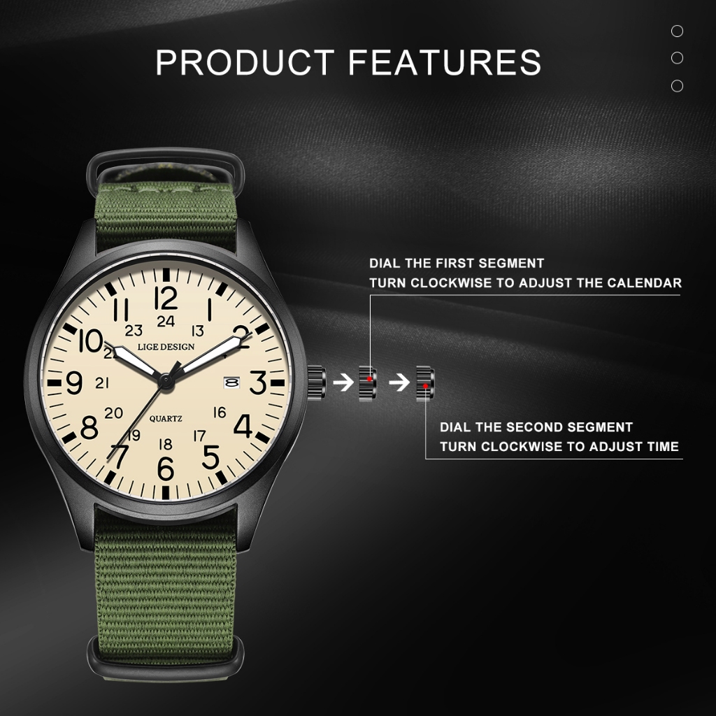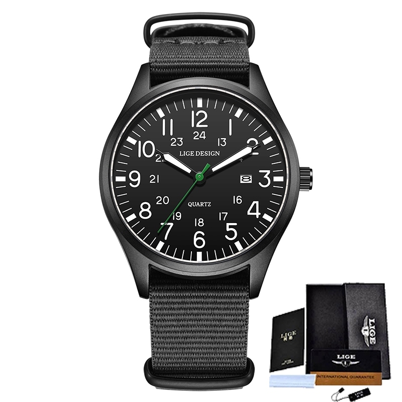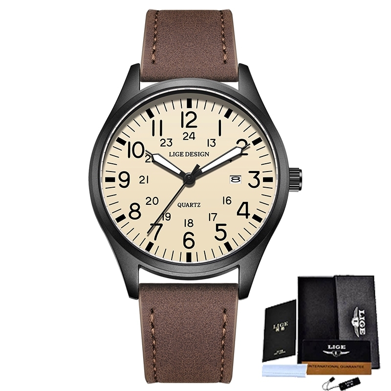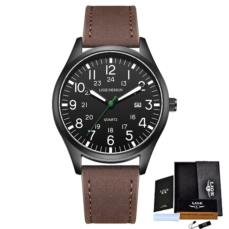 LIGE นาฬิกาข้อมือผู้ชาย แค่ นาฬิกาสําหรับผู้ชายกันน้ําเรืองแสงกีฬาควอตซ์ปฏิทินหนังนาฬิกาข้อมือ